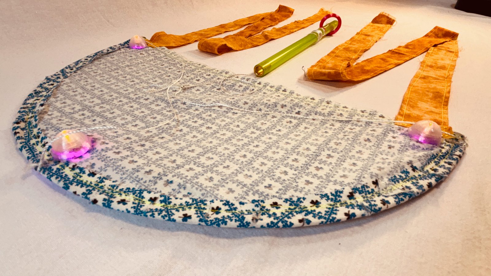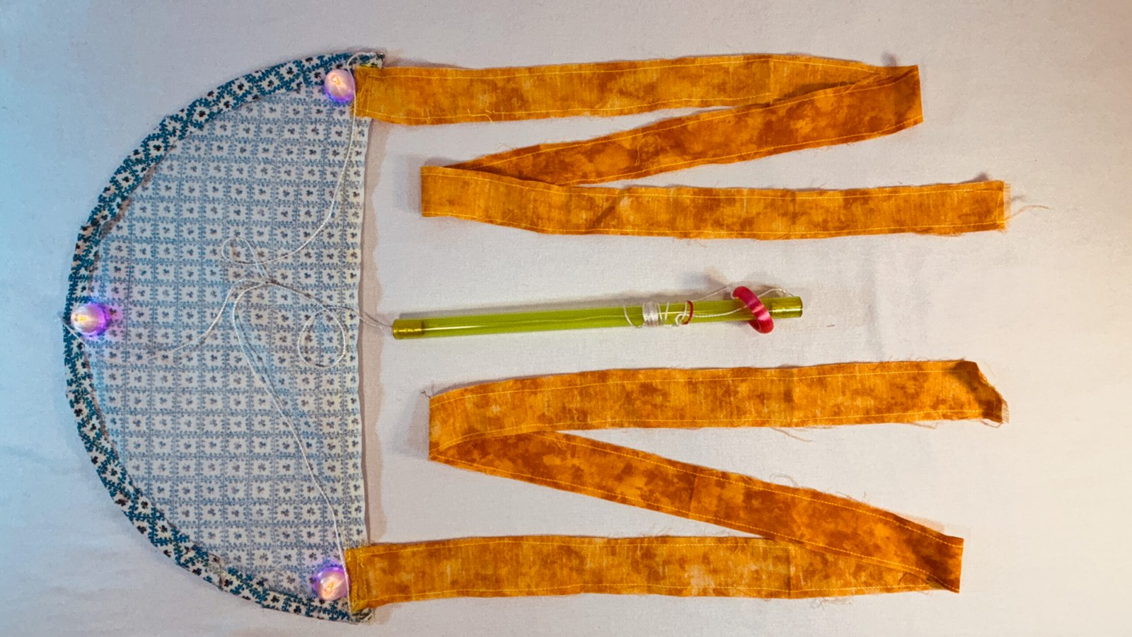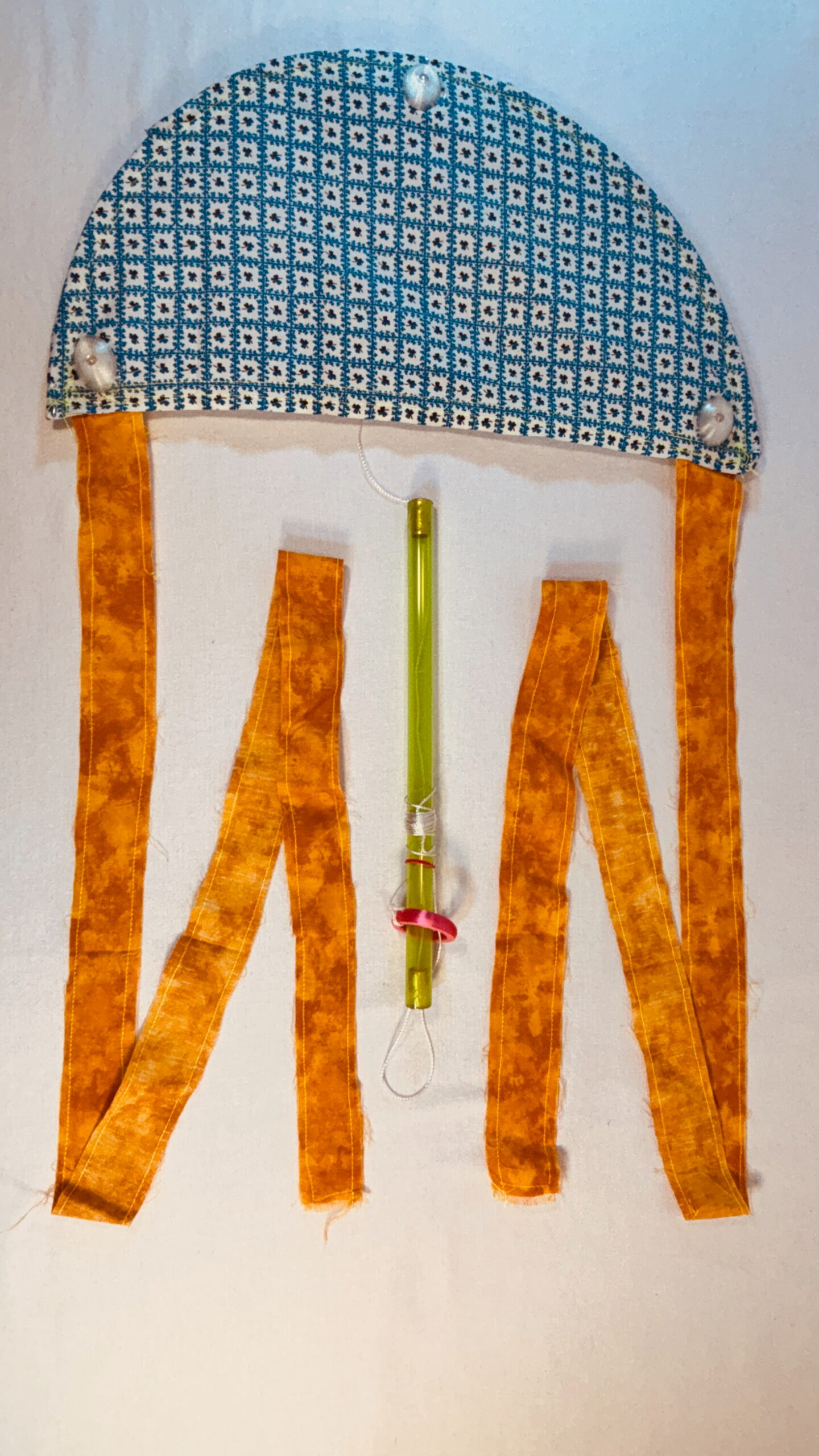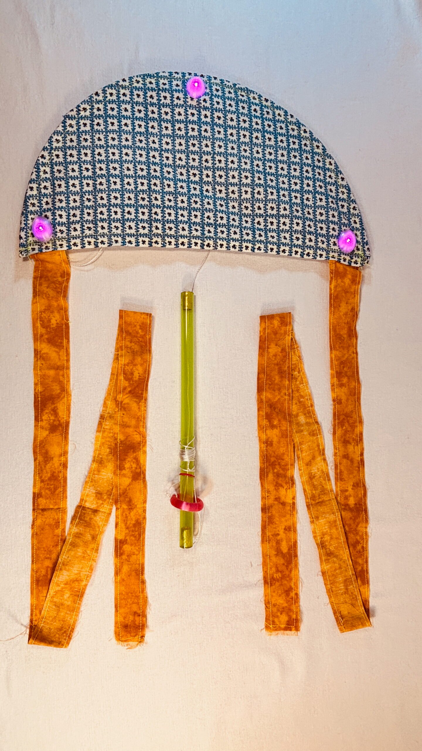 Super Flow Flyer Yo! Have a blast with this small performance kite that you can fly without any wind and just about anywhere! Imara is coy with blue and white floral flyer sail pattern, and orange tails and green wand, with 6 LED lights, 3 pink, 2 orange, and 1 yellow. Waving the wand in one hand while pulling the fly line through it with the other hand, makes the Super Flow Flyer dance in the air! It is highly responsive and flies and turns like a high-performance jet and traces out groovy swirly lines. Each Super Flow Flyer is unique; I make them by hand with fun fabric scraps or tie-dyed silks with cool colors and designs. They are built strong but intentionally a bit rough around the edges. I am happy to have a patent pending (19/259,967) on the Super Flow Flyer Yo!
