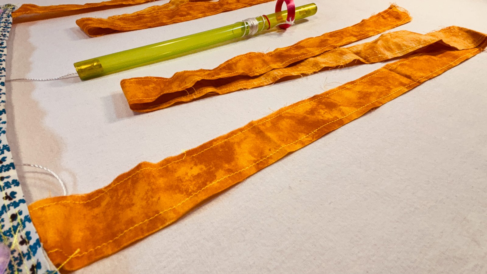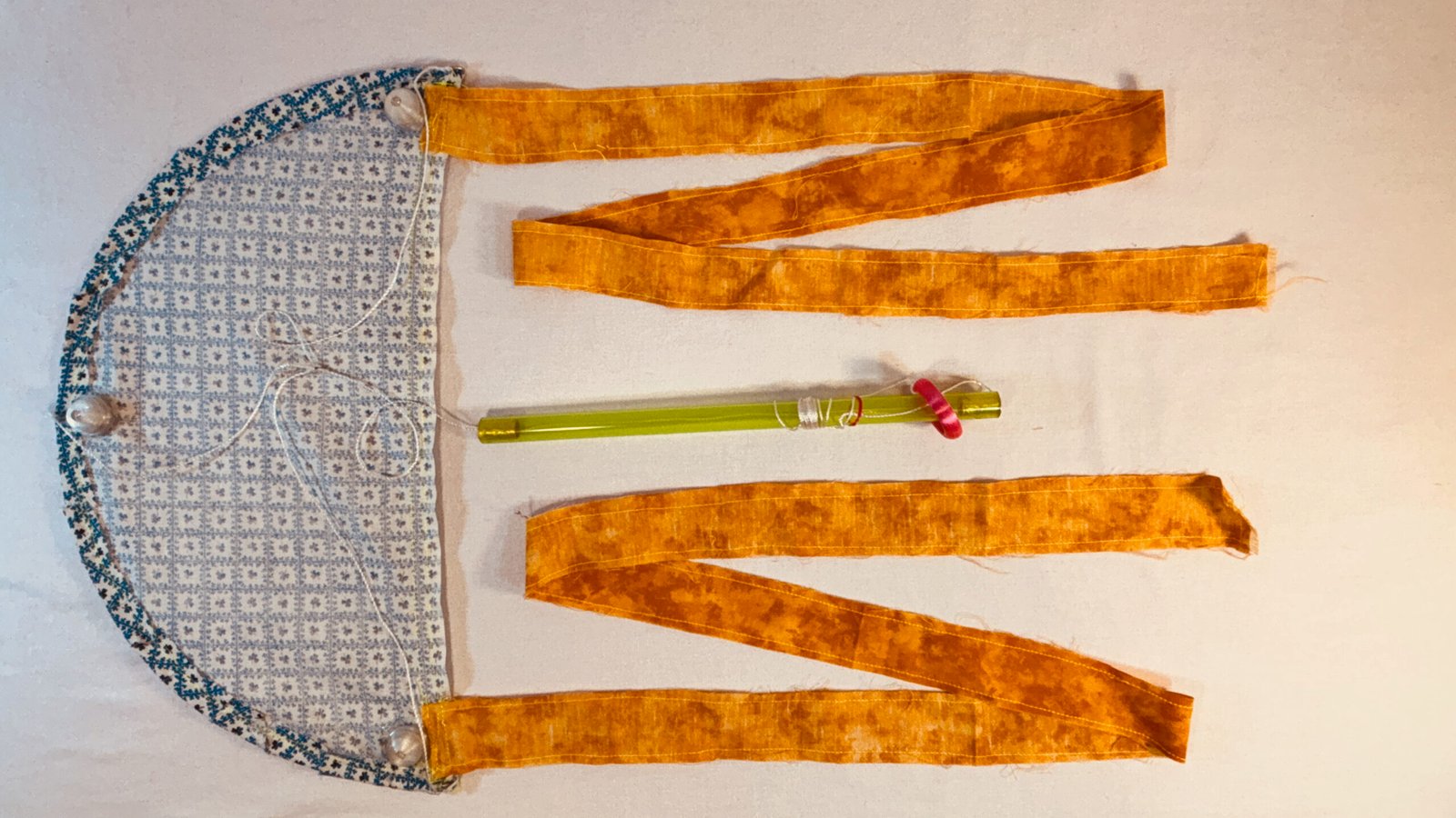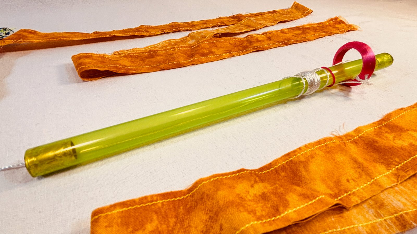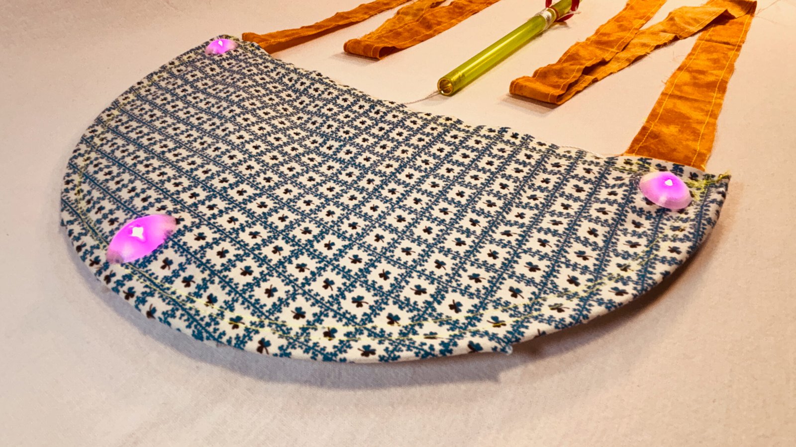 Super Flow Flyer Yo! Have a blast with this small performance kite that you can fly without any wind and just about anywhere! Imara is coy with blue and white floral flyer sail pattern, and orange tails and green wand, with 6 LED lights, 3 pink, 2 orange, and 1 yellow. Waving the wand in one hand while pulling the fly line through it with the other hand, makes the Super Flow Flyer dance in the air! It is highly responsive and flies and turns like a high-performance jet and traces out groovy swirly lines. Each Super Flow Flyer is unique; I make them by hand with fun fabric scraps or tie-dyed silks with cool colors and designs. They are built strong but intentionally a bit rough around the edges. I am happy to have a patent pending (19/259,967) on the Super Flow Flyer Yo!