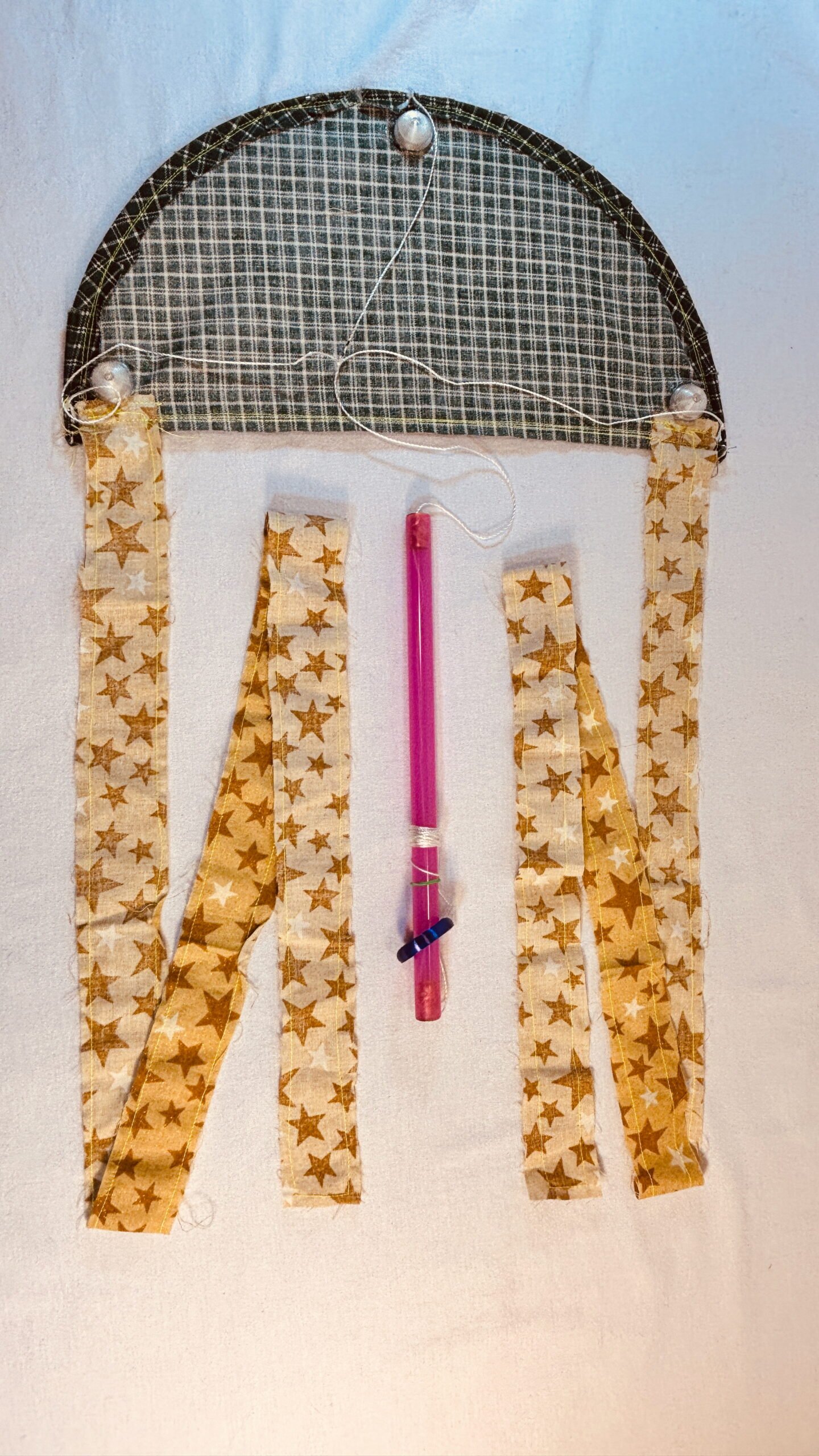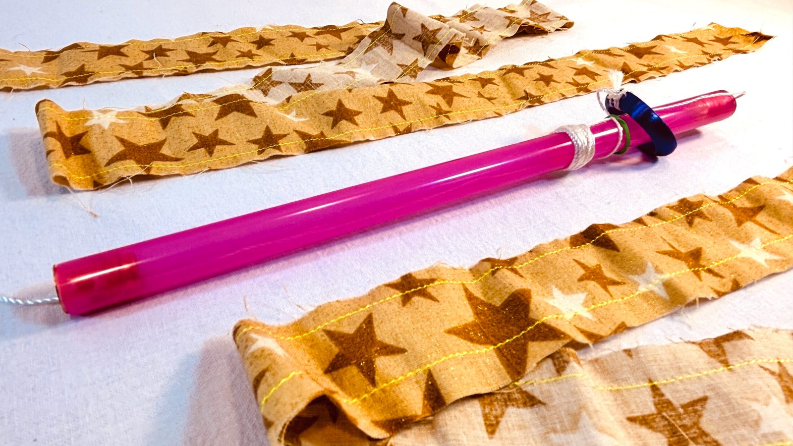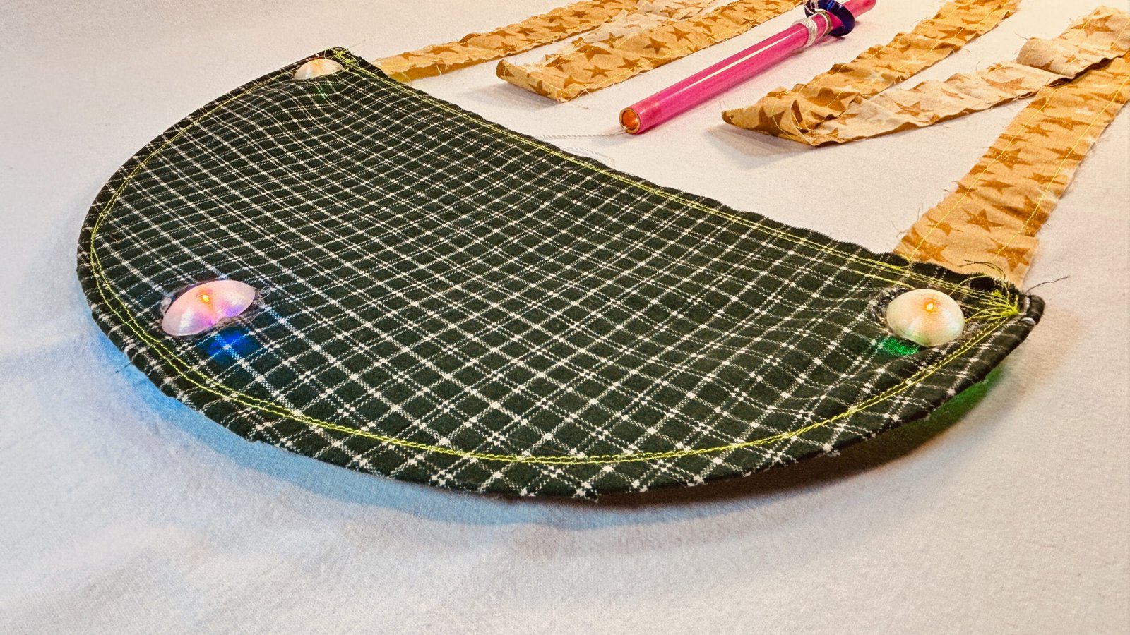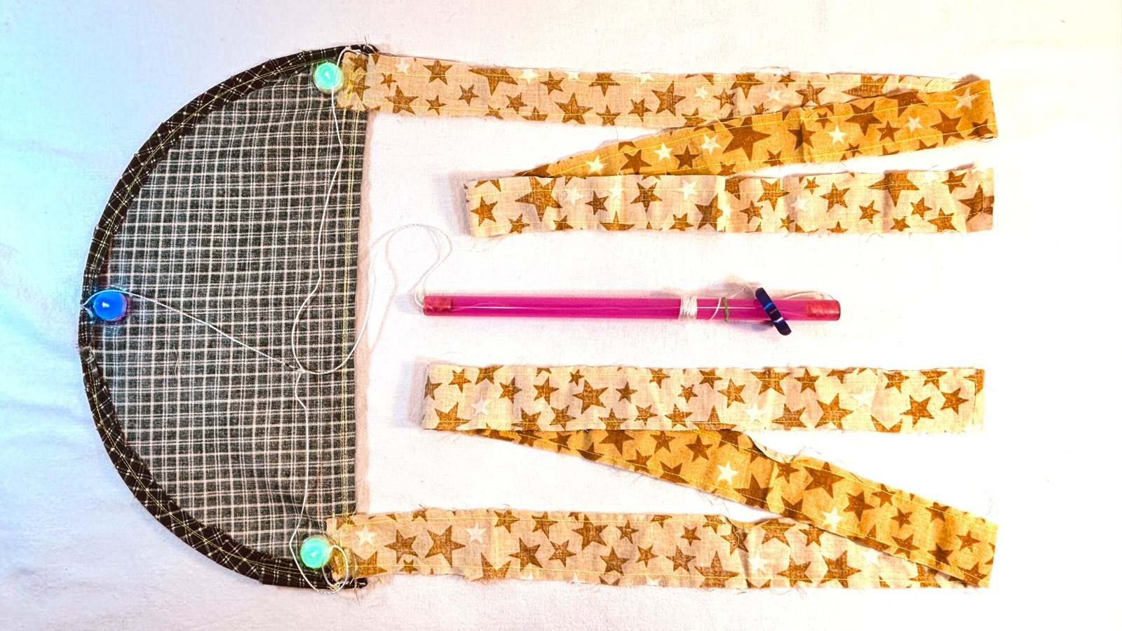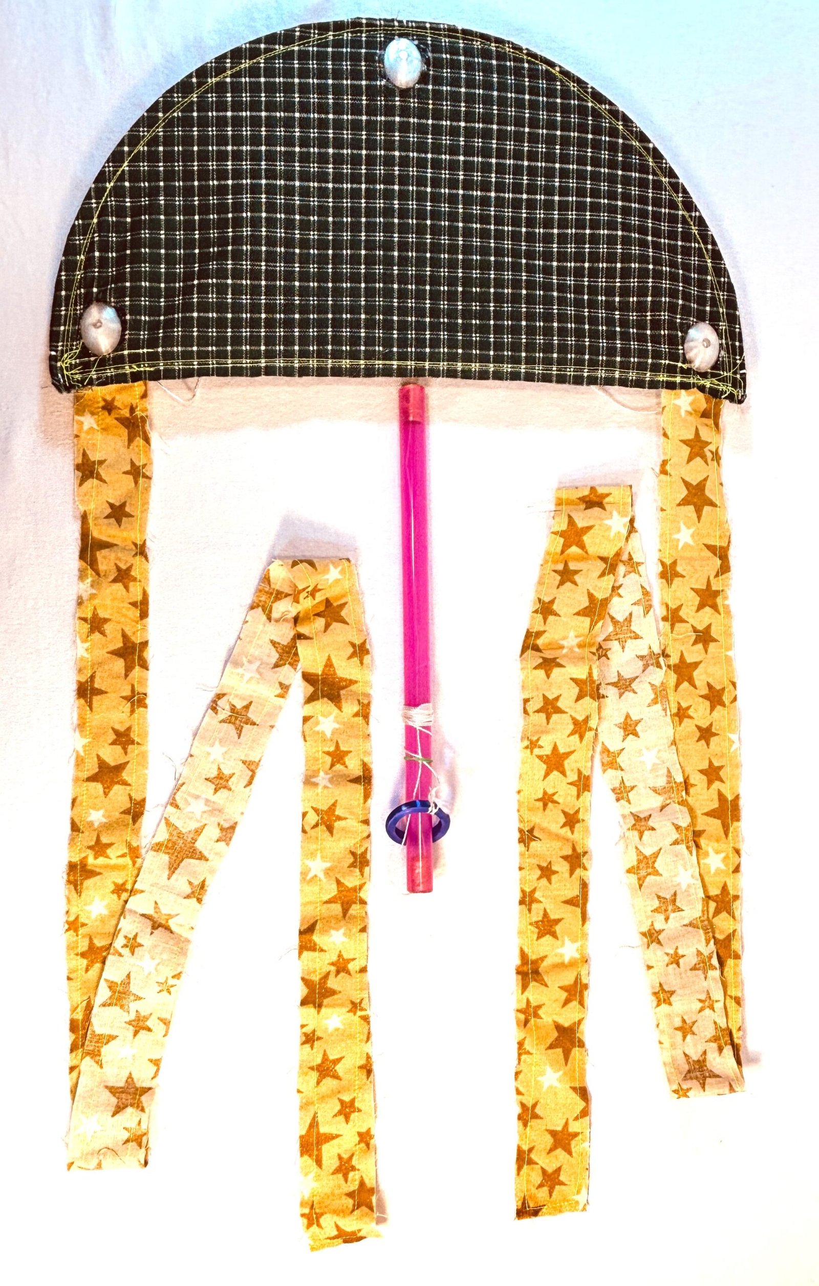 Super Flow Flyer Yo! Have a blast with this small performance kite that you can fly without any wind and just about anywhere! August is steadfast with green graphic stars flyer sail pattern, and beige tails and pink wand, with 6 LED lights, 3 orange, 2 green, and 1 blue. Waving the wand in one hand while pulling the fly line through it with the other hand, makes the Super Flow Flyer dance in the air! It is highly responsive and flies and turns like a high-performance jet and traces out groovy swirly lines. Each Super Flow Flyer is unique; I make them by hand with fun fabric scraps or tie-dyed silks with cool colors and designs. They are built strong but intentionally a bit rough around the edges. I am happy to have a patent pending (19/259,967) on the Super Flow Flyer Yo!