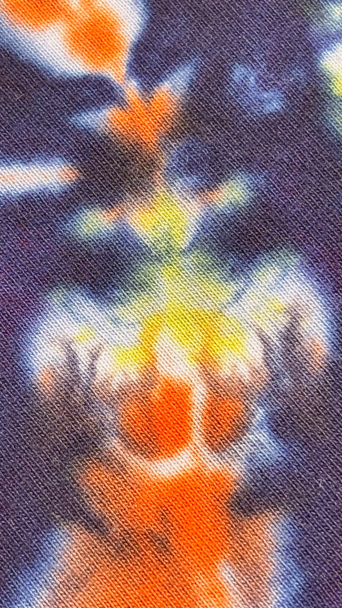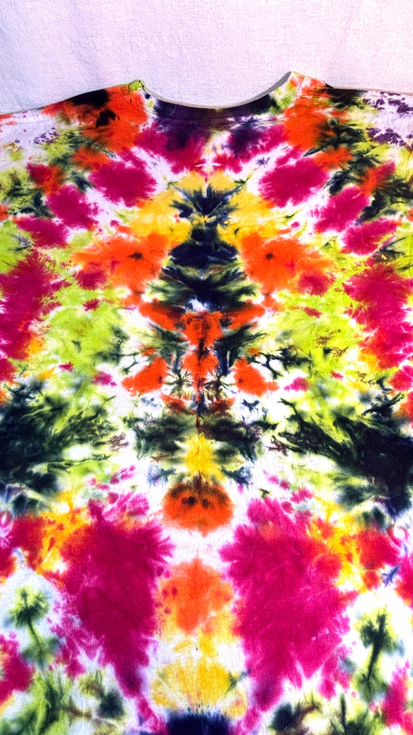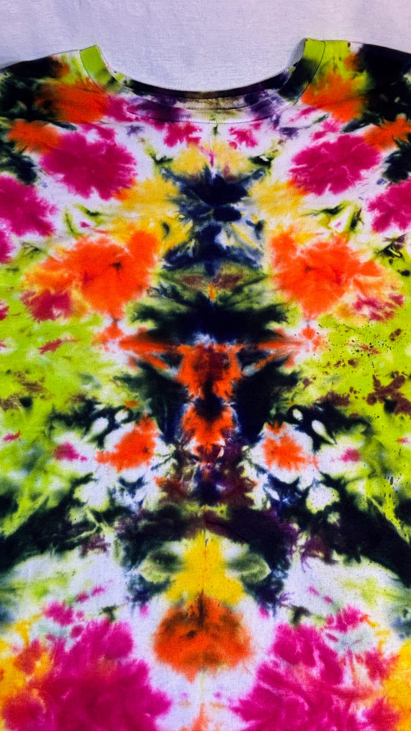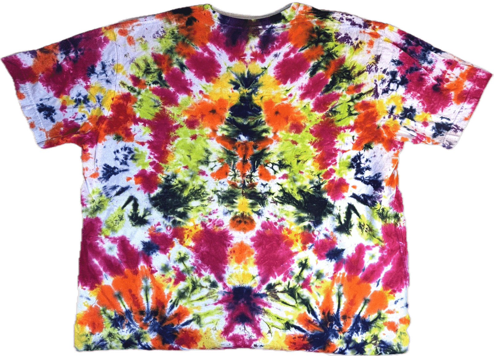 Super Flow Dyes Yo! All of my tie dye t-shirts combine kind design with vibrant and saturated colors. De’Shaun is hyper-chill with orange, yellow, green, blue, fuchsia, purple crumple-mirror pattern. The source t-shirt is an LAT Style 6901 – made out of their super soft 4.5 oz. 100% combed ringspun cotton jersey. Comes with EasyTearTM label. Double-needle hem sleeves and bottom. Sewn with 100% cotton thread. Produced by a WRAP certified garment factory in Bangladesh. I design and make all my tie dyes by hand with love and care in Oak Park, Illinois, USA.