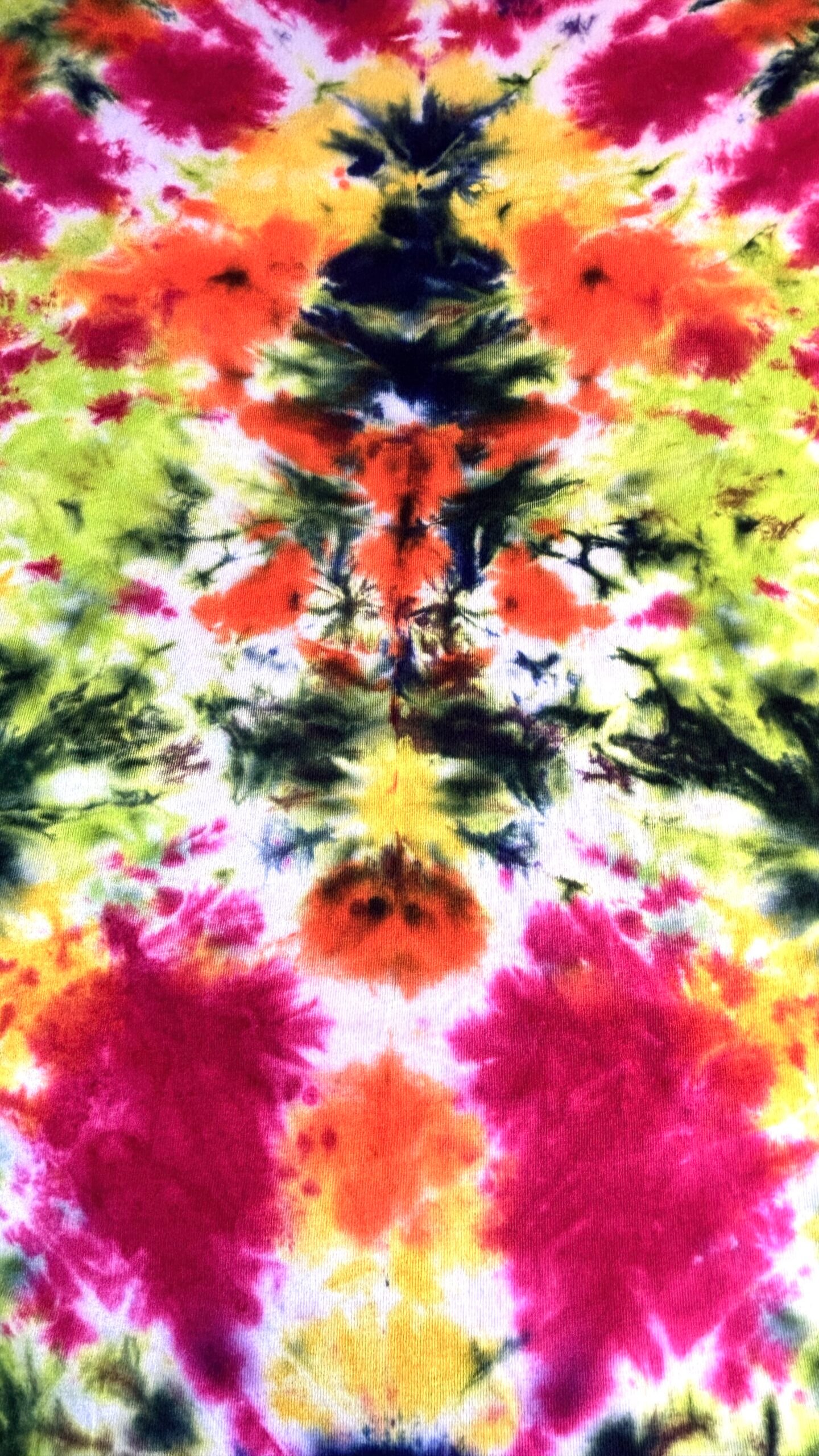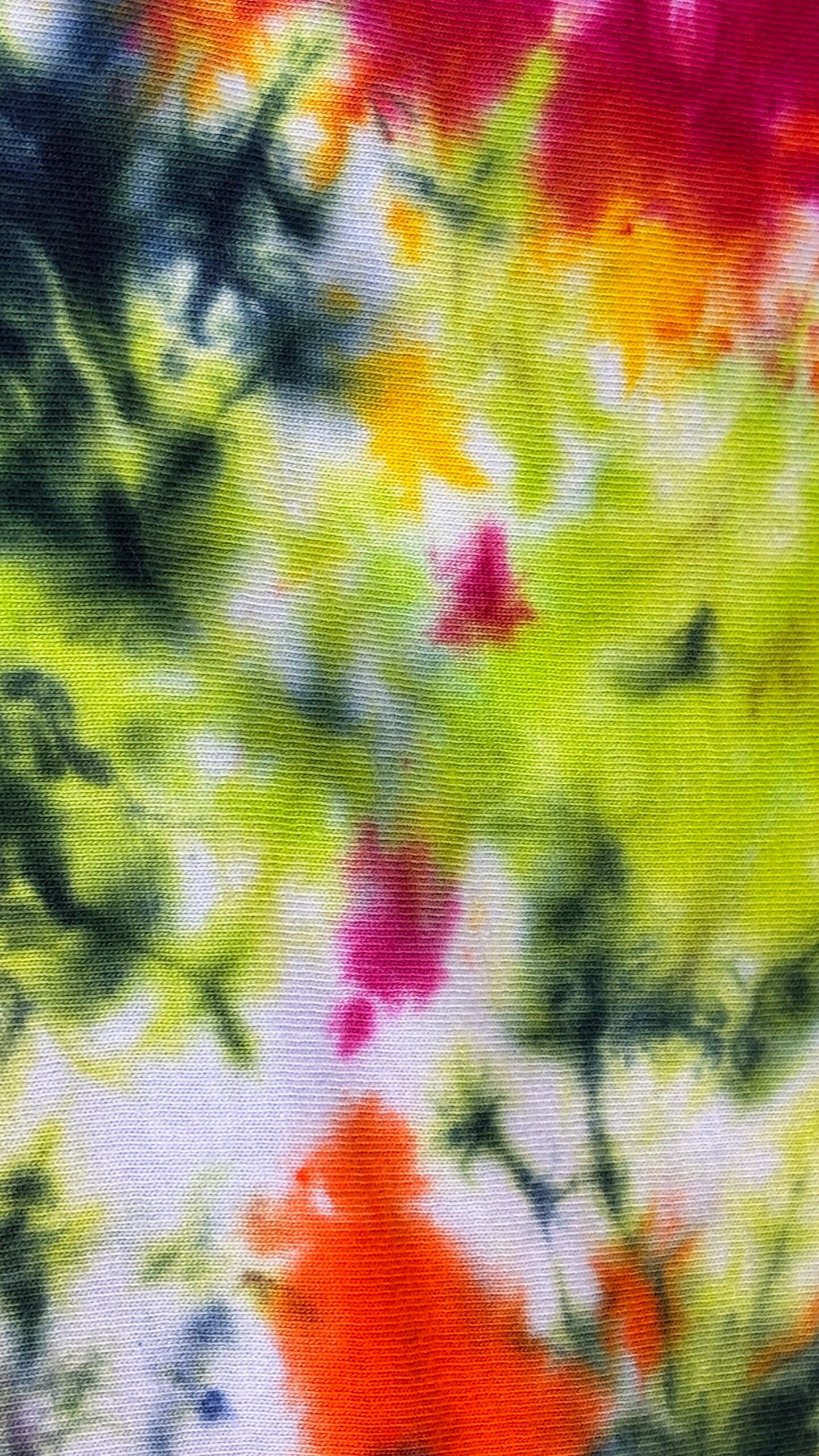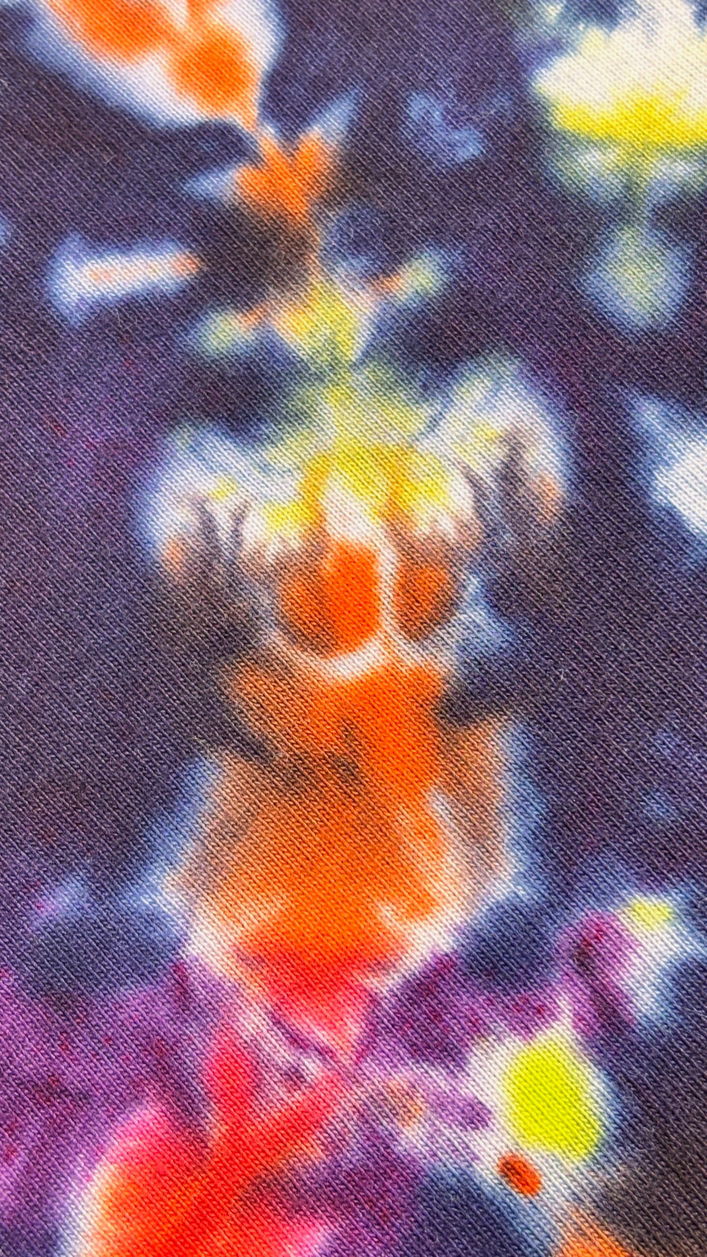 Super Flow Dyes Yo! All of my tie dye t-shirts combine kind design with vibrant and saturated colors. De’Shaun is hyper-chill with orange, yellow, green, blue, fuchsia, purple crumple-mirror pattern. The source t-shirt is an LAT Style 6901 – made out of their super soft 4.5 oz. 100% combed ringspun cotton jersey. Comes with EasyTearTM label. Double-needle hem sleeves and bottom. Sewn with 100% cotton thread. Produced by a WRAP certified garment factory in Bangladesh. I design and make all my tie dyes by hand with love and care in Oak Park, Illinois, USA.