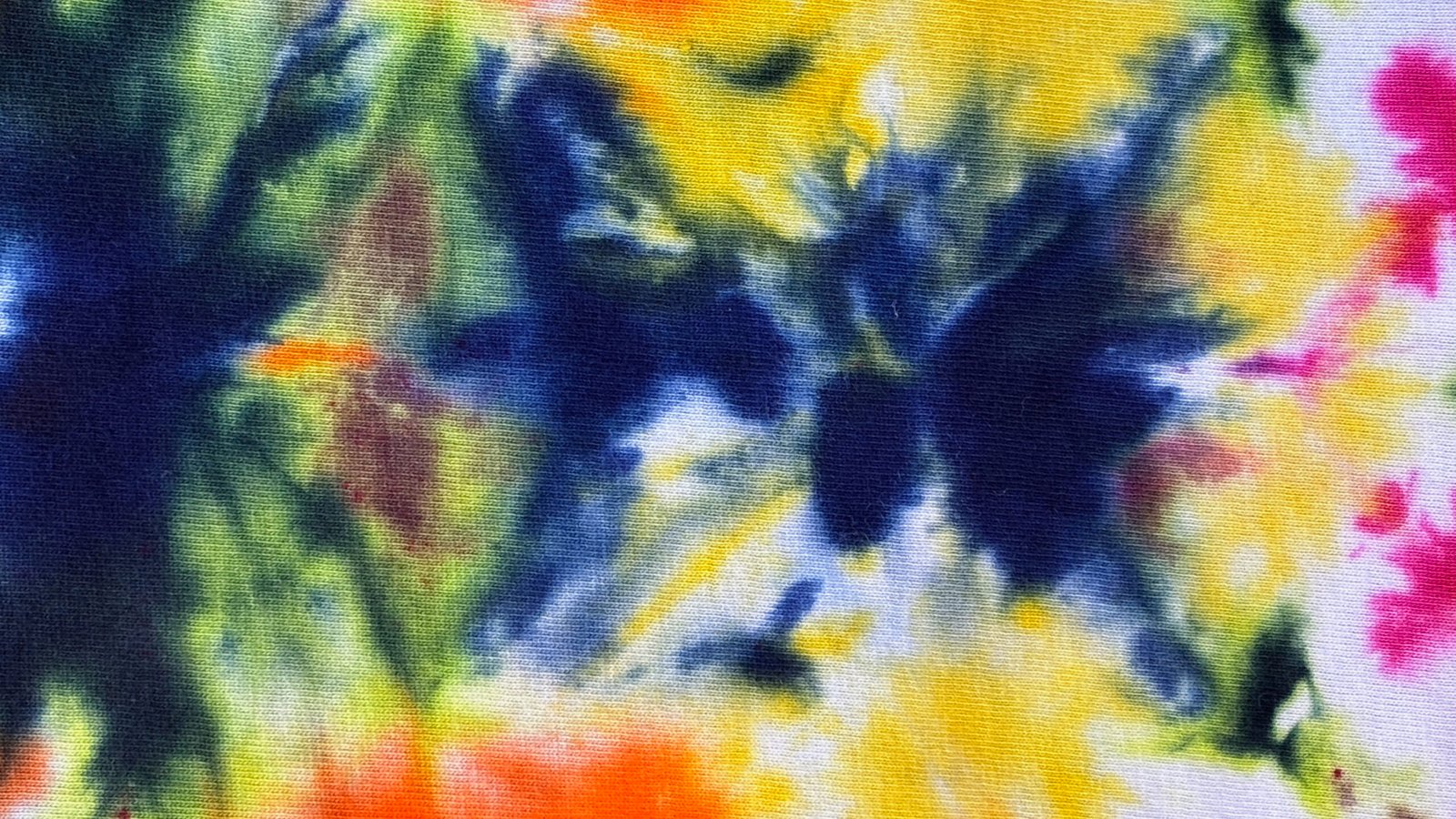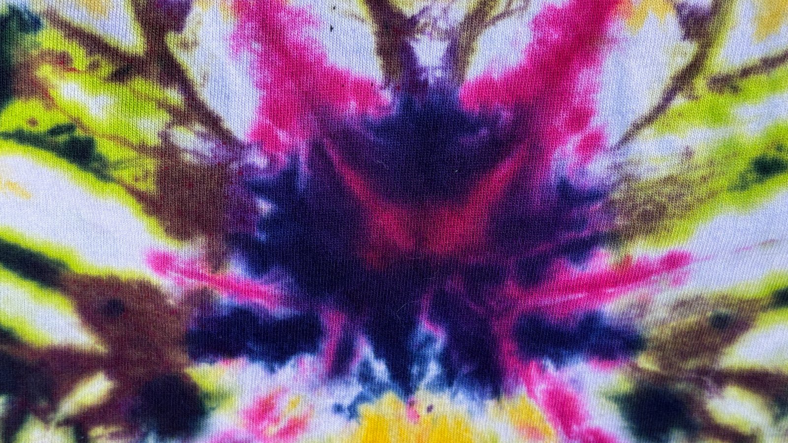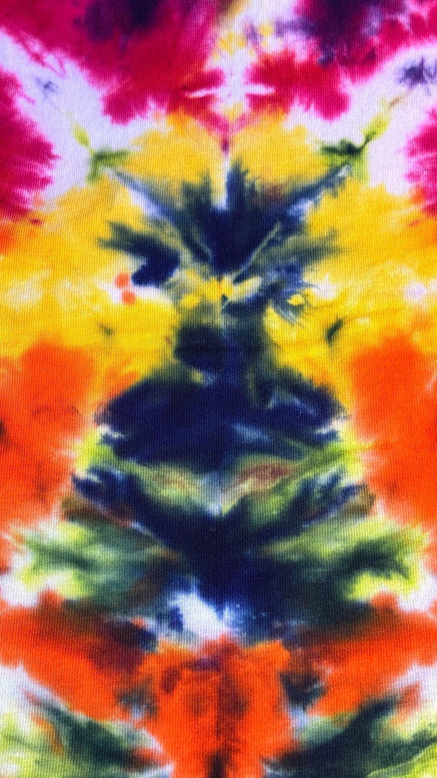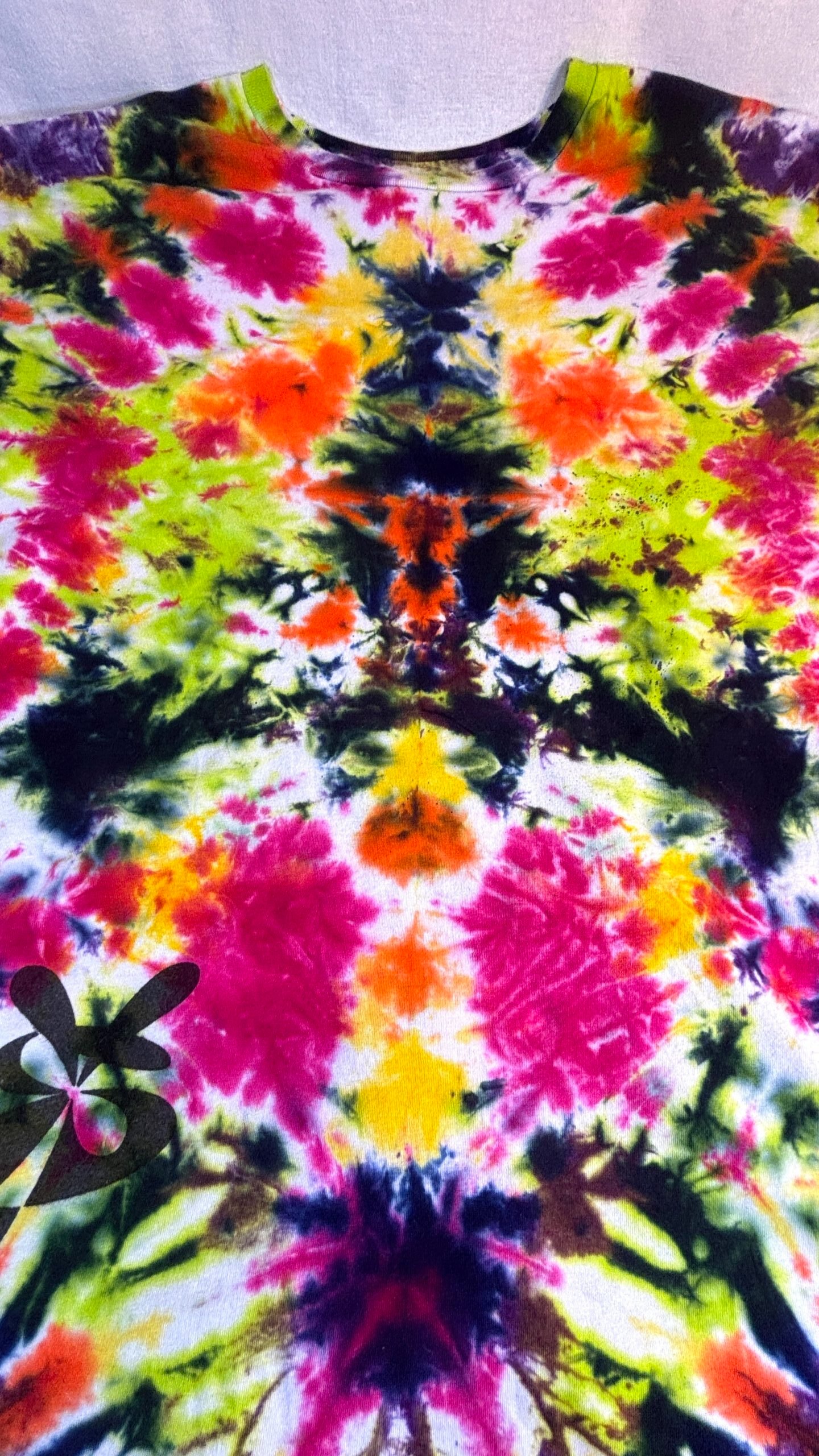 Super Flow Dyes Yo! All of my tie dye t-shirts combine kind design with vibrant and saturated colors. De’Shaun is hyper-chill with orange, yellow, green, blue, fuchsia, purple crumple-mirror pattern. The source t-shirt is an LAT Style 6901 – made out of their super soft 4.5 oz. 100% combed ringspun cotton jersey. Comes with EasyTearTM label. Double-needle hem sleeves and bottom. Sewn with 100% cotton thread. Produced by a WRAP certified garment factory in Bangladesh. I design and make all my tie dyes by hand with love and care in Oak Park, Illinois, USA.