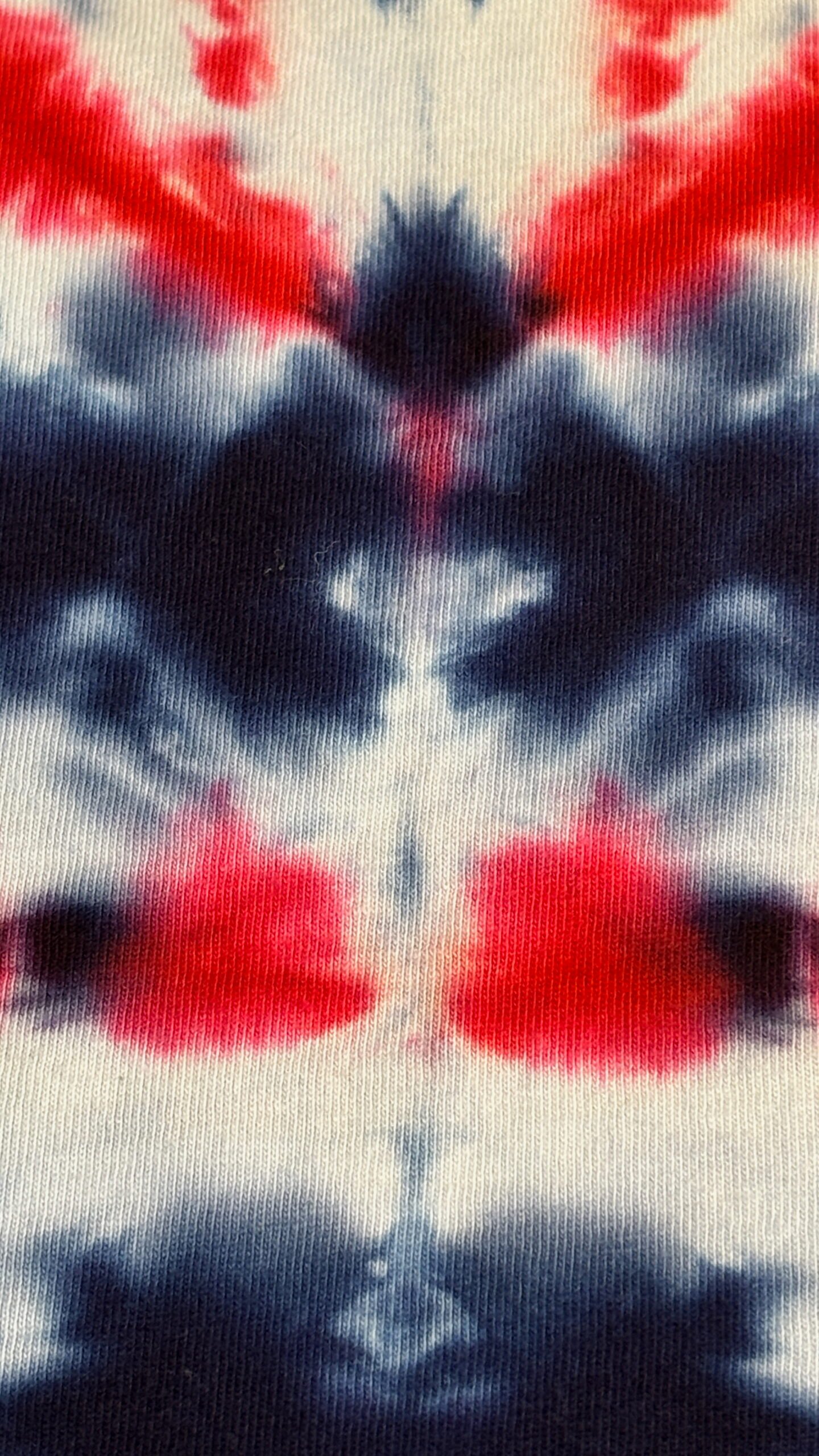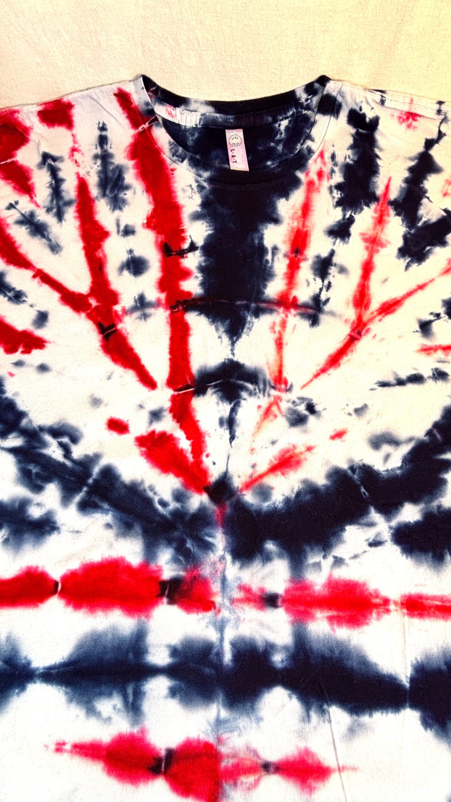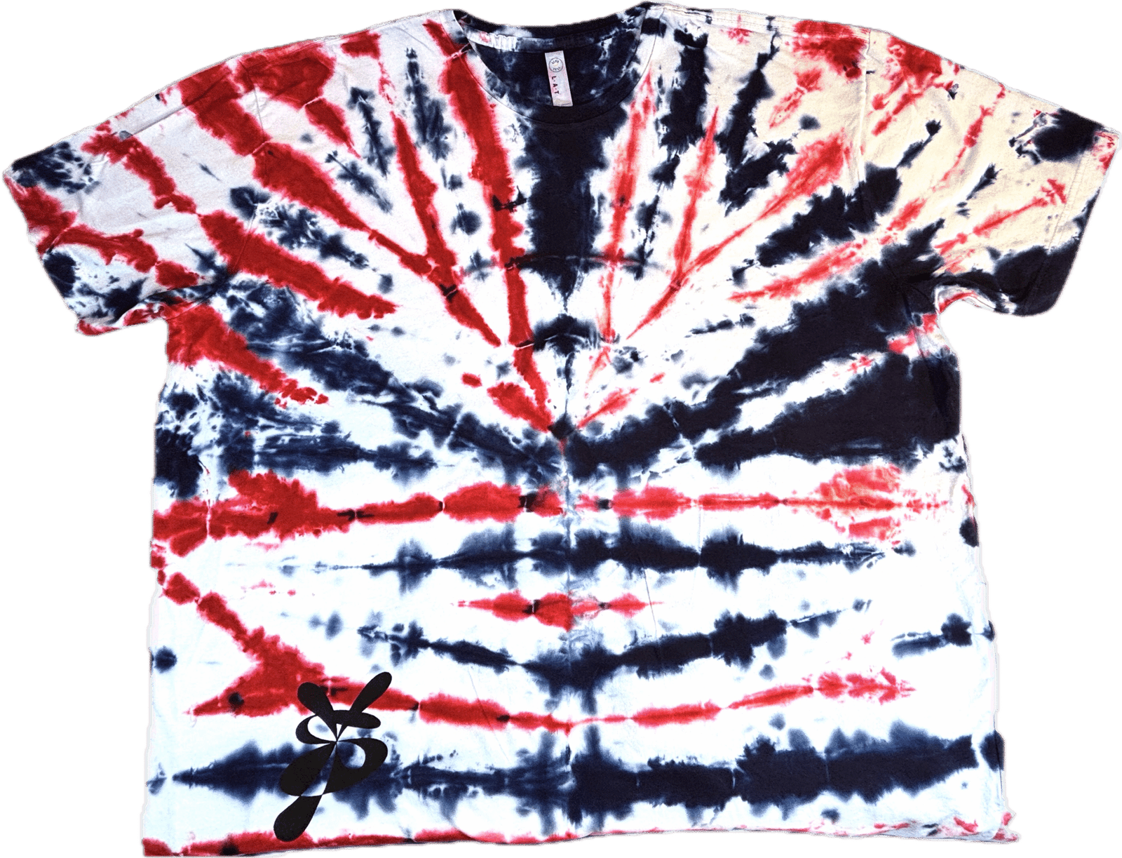 Super Flow Dyes Yo! All of my tie dye t-shirts combine kind design with vibrant and saturated colors. Jim is kind with blue, red, white branchy stripes pattern. The source t-shirt is an LAT Style 6901 – made out of their super soft 4.5 oz. 100% combed ringspun cotton jersey. Comes with EasyTearTM label. Double-needle hem sleeves and bottom. Sewn with 100% cotton thread. Produced by a WRAP certified garment factory in Bangladesh. I design and make all my tie dyes by hand with love and care in Oak Park, Illinois, USA.