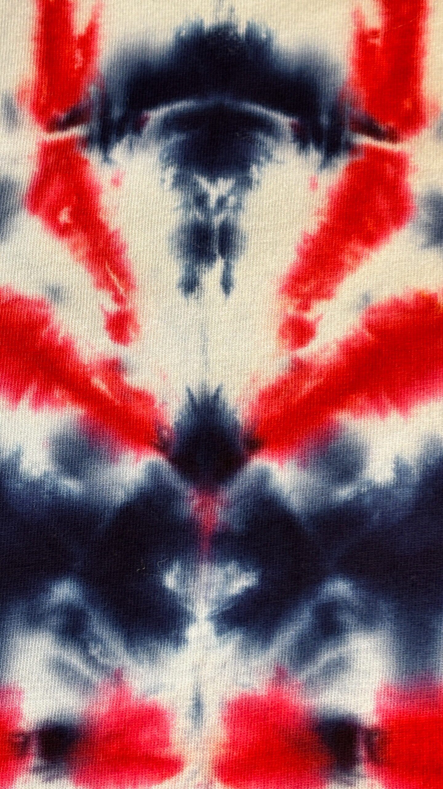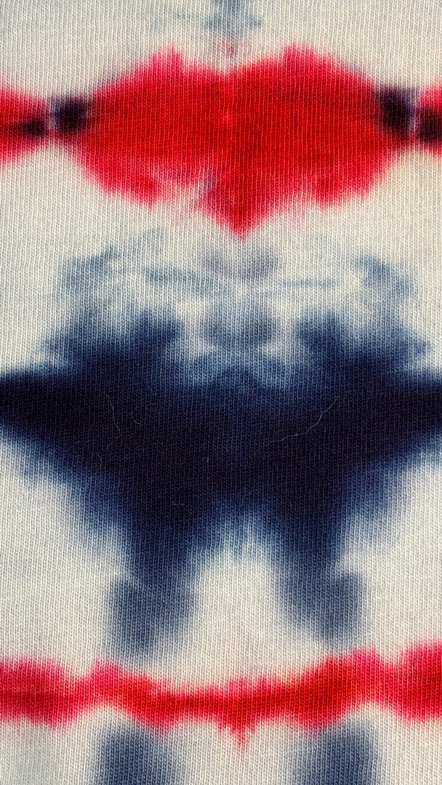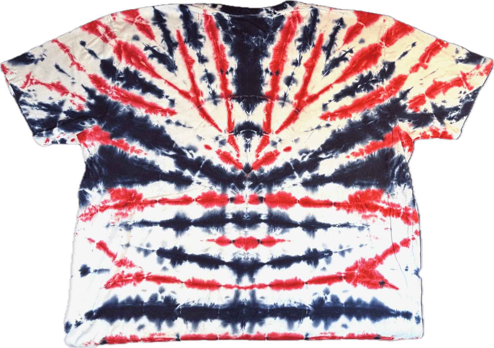 Super Flow Dyes Yo! All of my tie dye t-shirts combine kind design with vibrant and saturated colors. Jim is kind with blue, red, white branchy stripes pattern. The source t-shirt is an LAT Style 6901 – made out of their super soft 4.5 oz. 100% combed ringspun cotton jersey. Comes with EasyTearTM label. Double-needle hem sleeves and bottom. Sewn with 100% cotton thread. Produced by a WRAP certified garment factory in Bangladesh. I design and make all my tie dyes by hand with love and care in Oak Park, Illinois, USA.