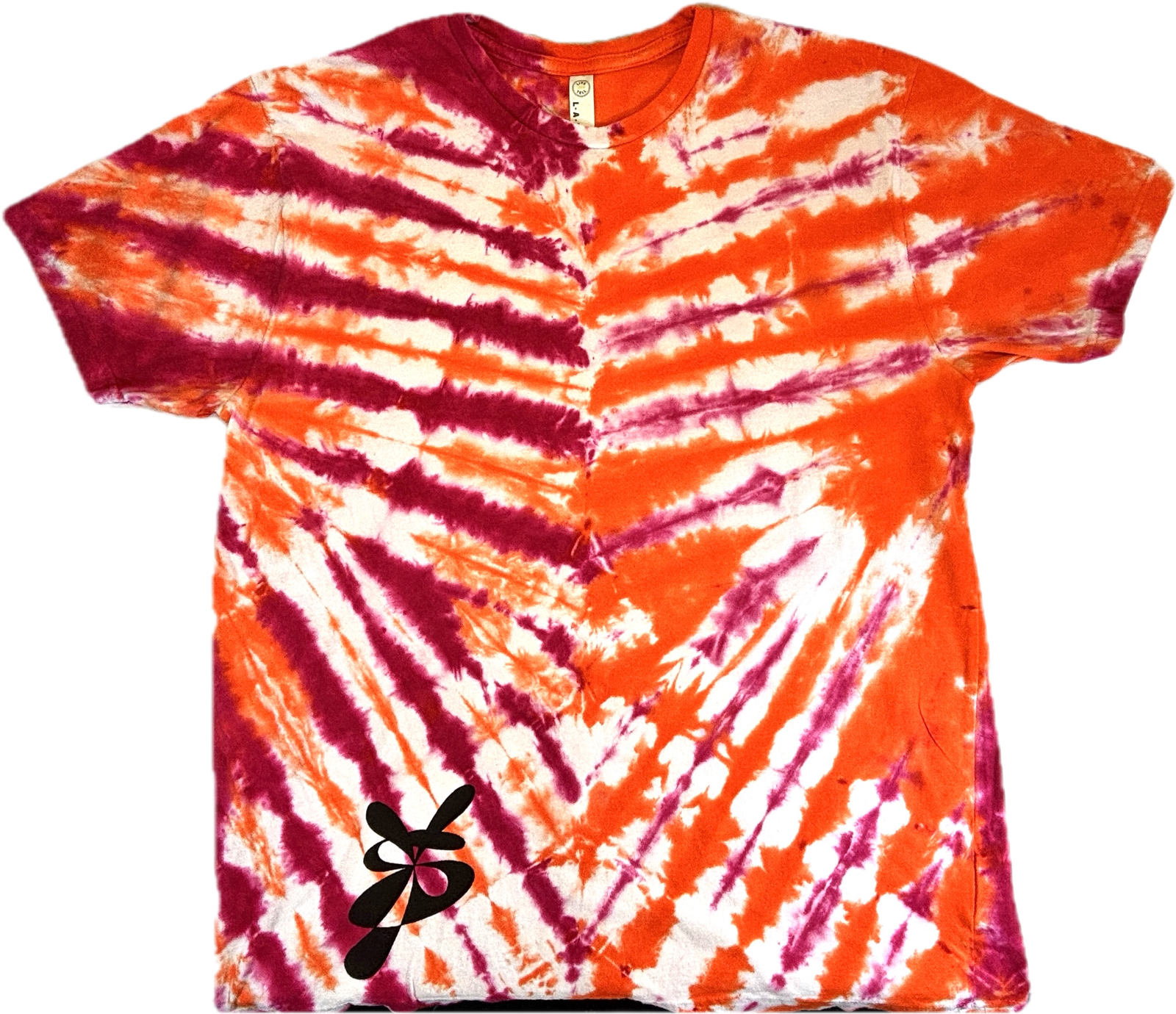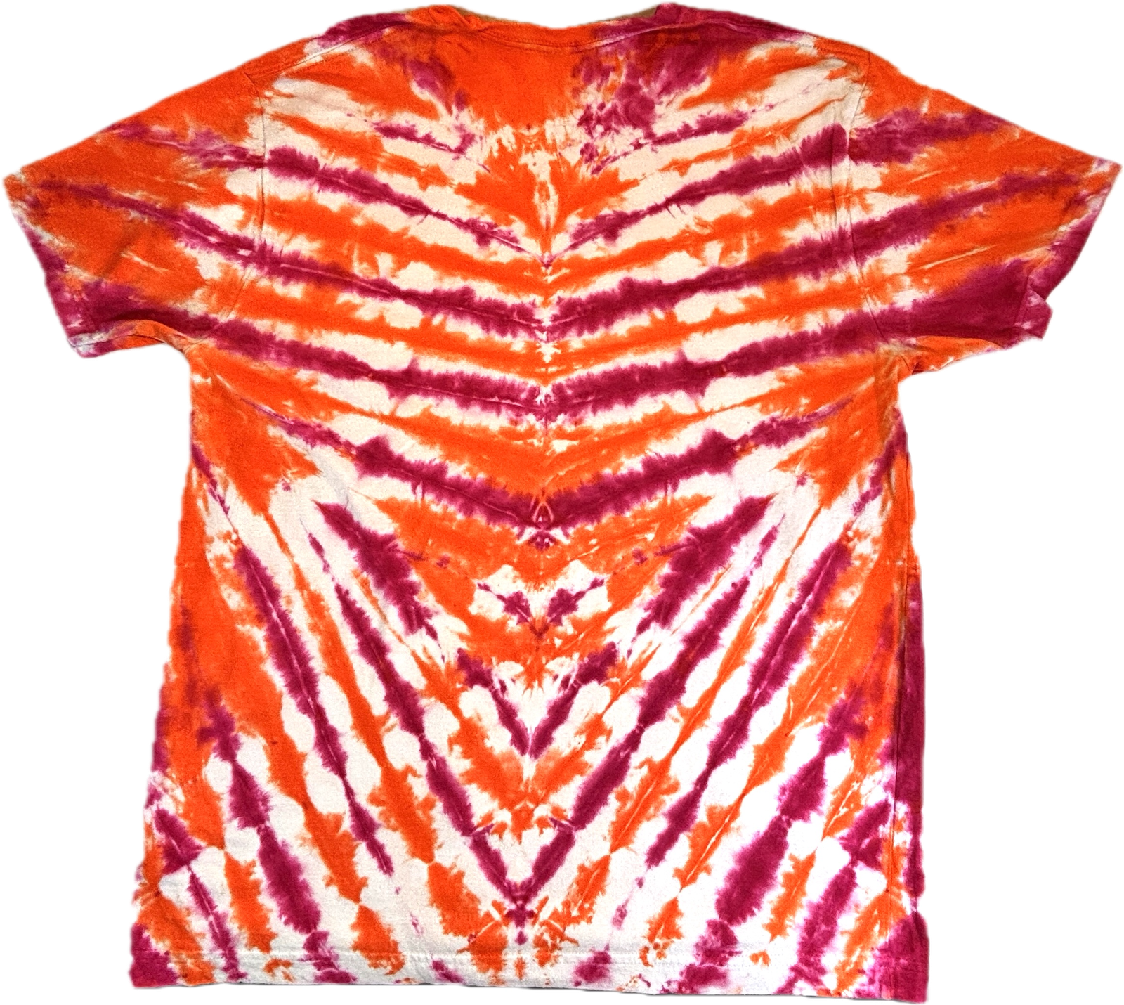 Super Flow Dyes Yo! All of my tie dye t-shirts combine kind design with vibrant and saturated colors. Nikhil is adventurous with orange, fuchsia v-stripes pattern. The source t-shirt is an LAT Style 6901 – made out of their super soft 4.5 oz. 100% combed ringspun cotton jersey. Comes with EasyTearTM label. Double-needle hem sleeves and bottom. Sewn with 100% cotton thread. Produced by a WRAP certified garment factory in Bangladesh. I design and make all my tie dyes by hand with love and care in Oak Park, Illinois, USA.