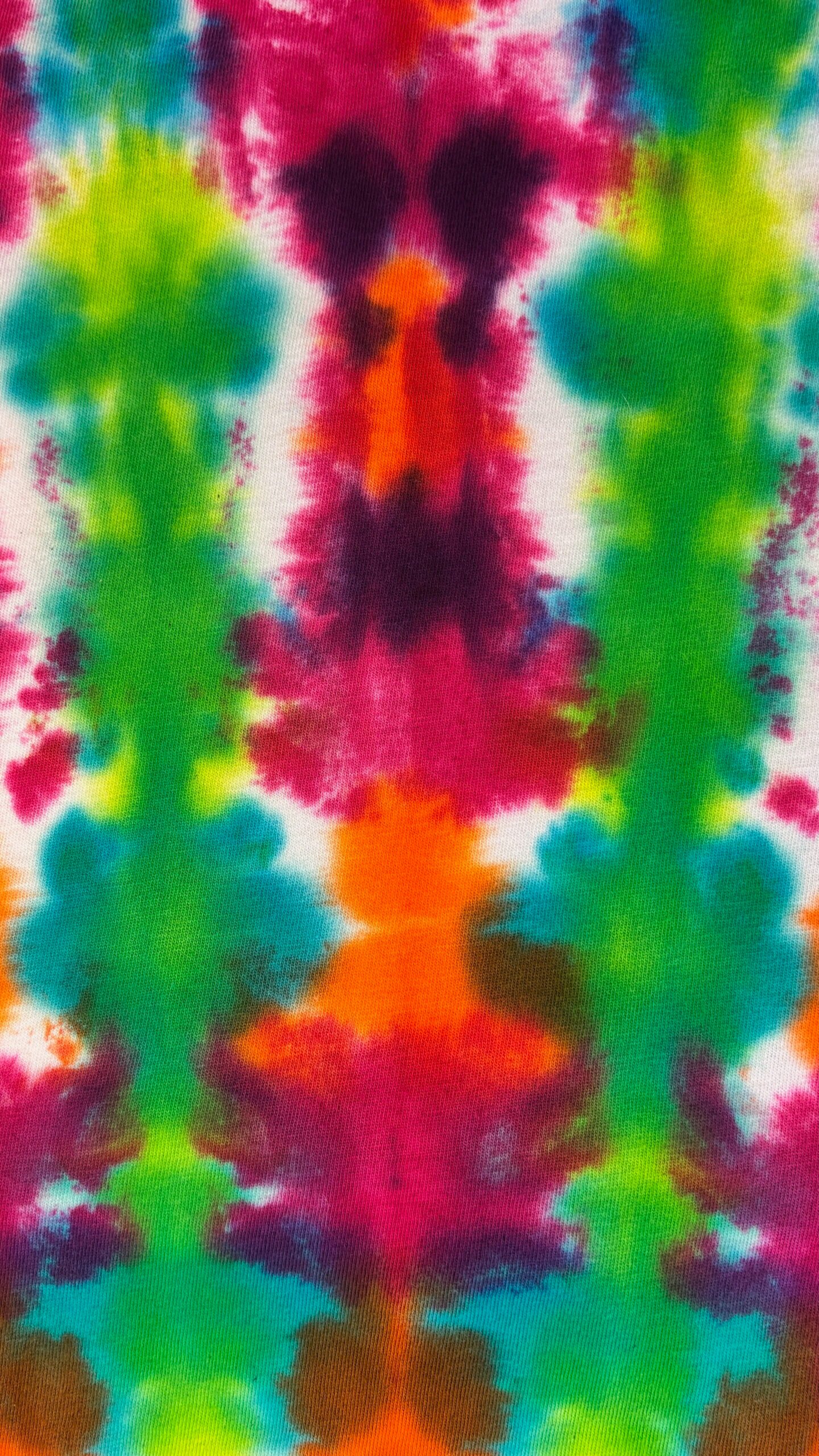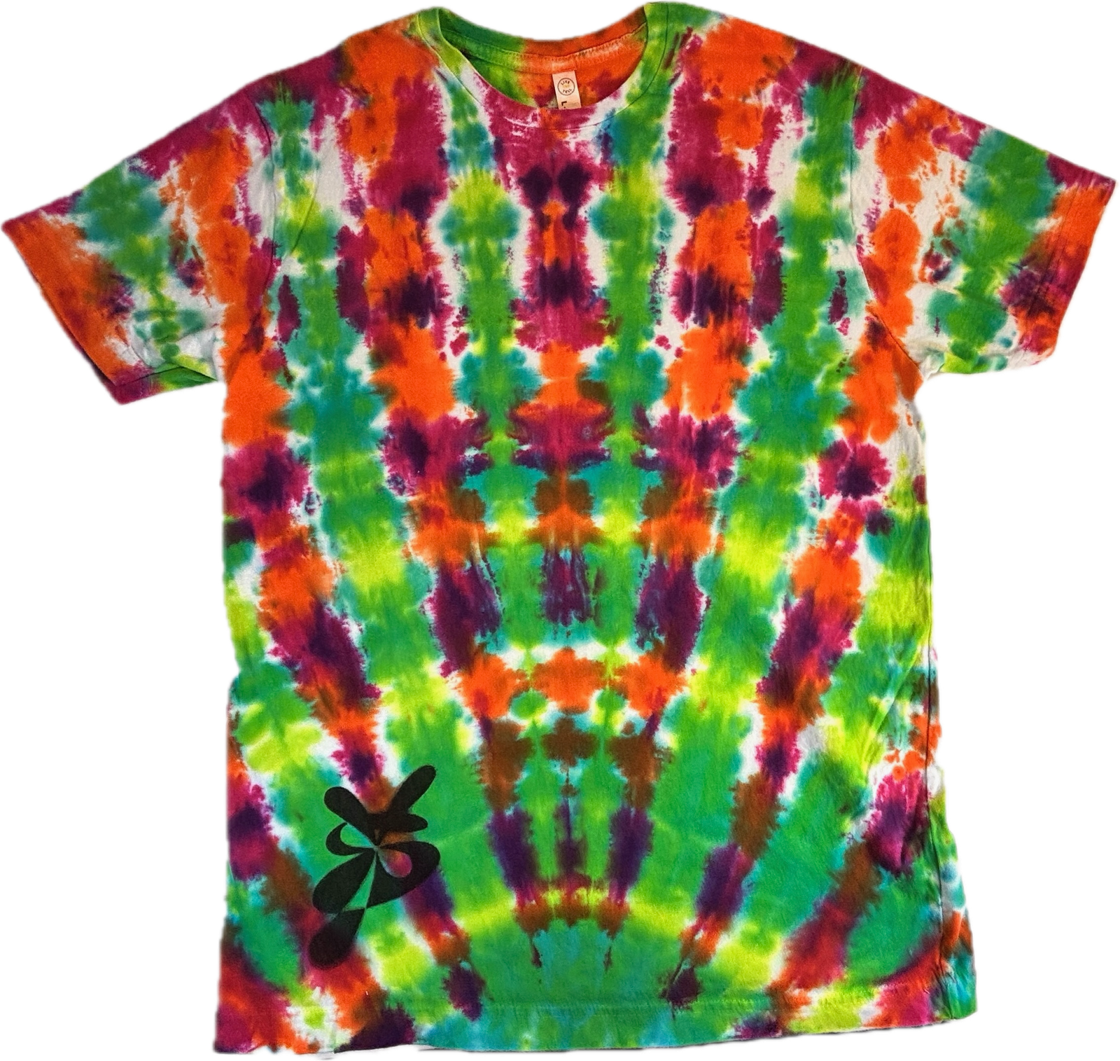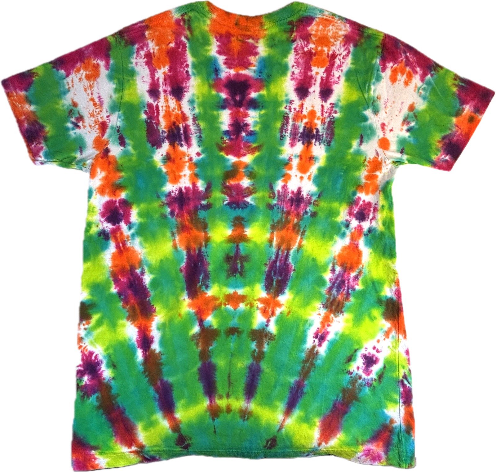 Super Flow Dyes Yo! All of my tie dye t-shirts combine kind design with vibrant and saturated colors. Yuko is contemplative with green, fuchsia, orange v-stripes pattern. The source t-shirt is an LAT Style 6901 – made out of their super soft 4.5 oz. 100% combed ringspun cotton jersey. Comes with EasyTearTM label. Double-needle hem sleeves and bottom. Sewn with 100% cotton thread. Produced by a WRAP certified garment factory in Bangladesh. I design and make all my tie dyes by hand with love and care in Oak Park, Illinois, USA.