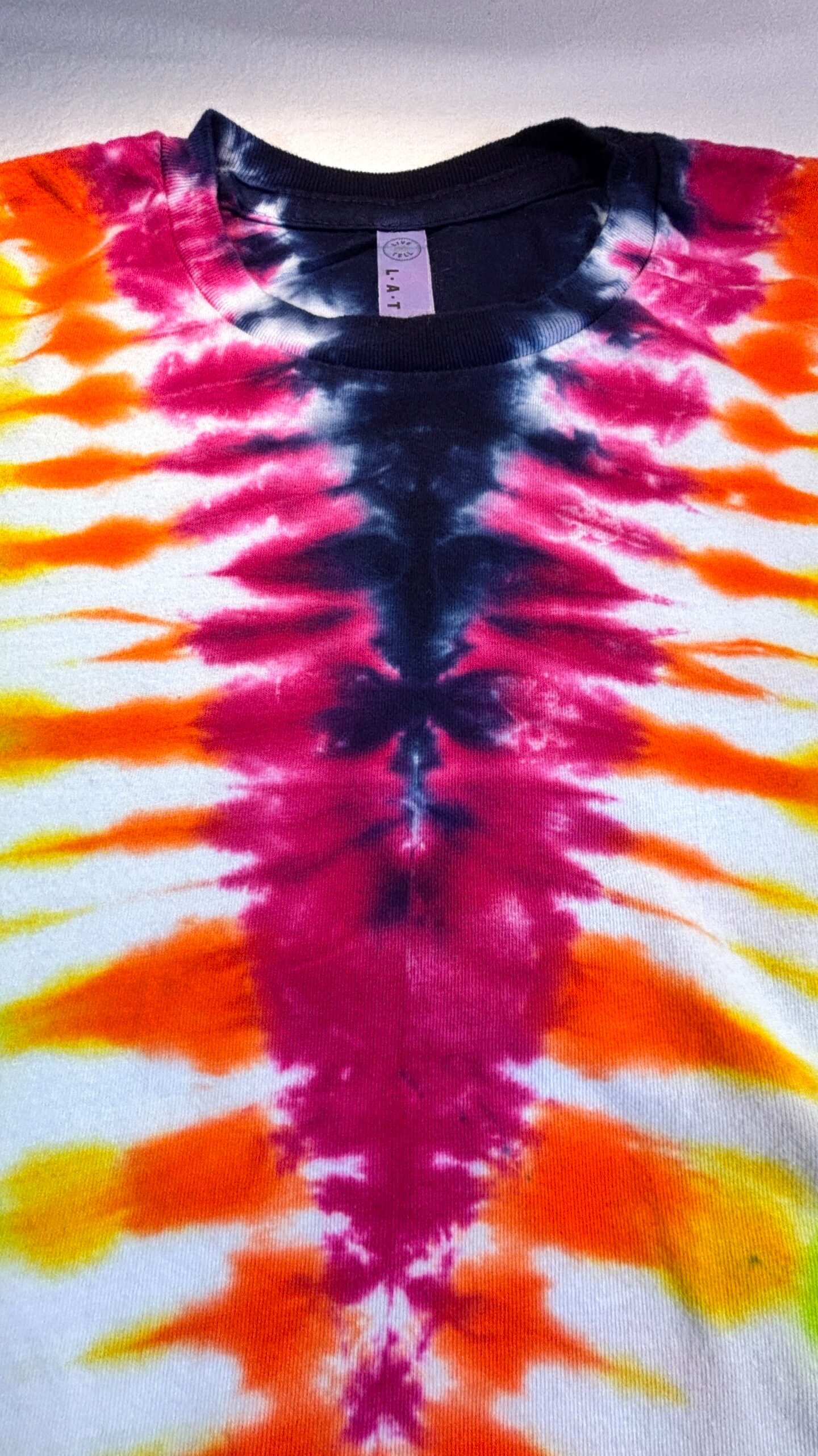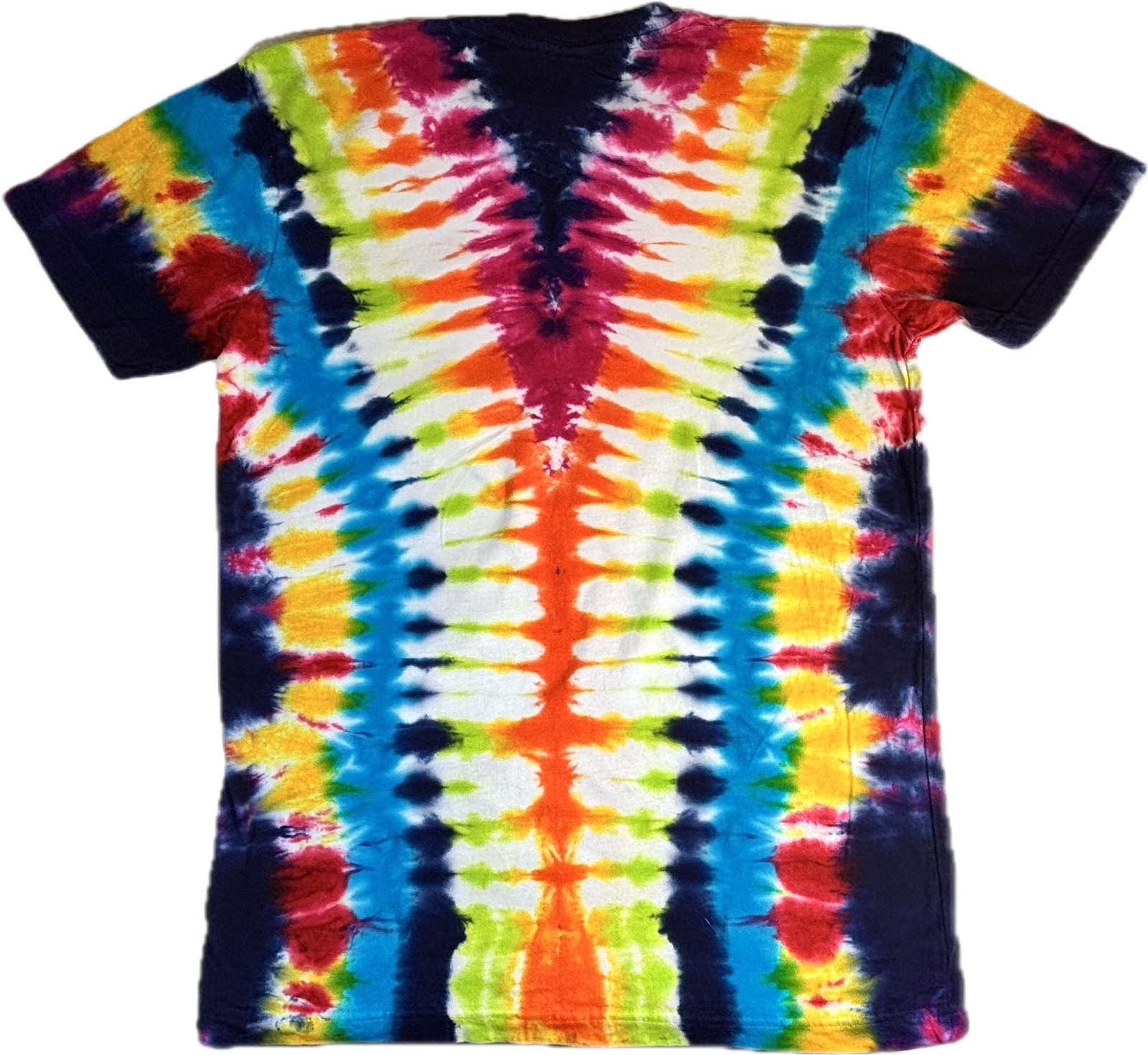 Super Flow Dyes Yo! All of my tie dye t-shirts combine kind design with vibrant and saturated colors. Mansa is down to clown with orange, yellow, greenblue, yellow, fuchsia, purple, rainbow y-shaped horizontal stripes pattern. The source t-shirt is an LAT Style 6901 – made out of their super soft 4.5 oz. 100% combed ringspun cotton jersey. Comes with EasyTearTM label. Double-needle hem sleeves and bottom. Sewn with 100% cotton thread. Produced by a WRAP certified garment factory in Bangladesh. I design and make all my tie dyes by hand with love and care in Oak Park, Illinois, USA.