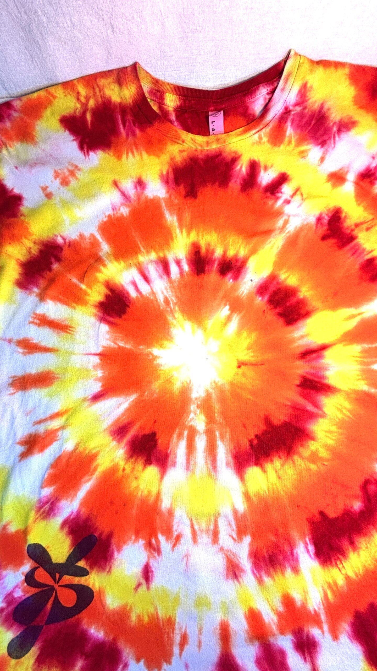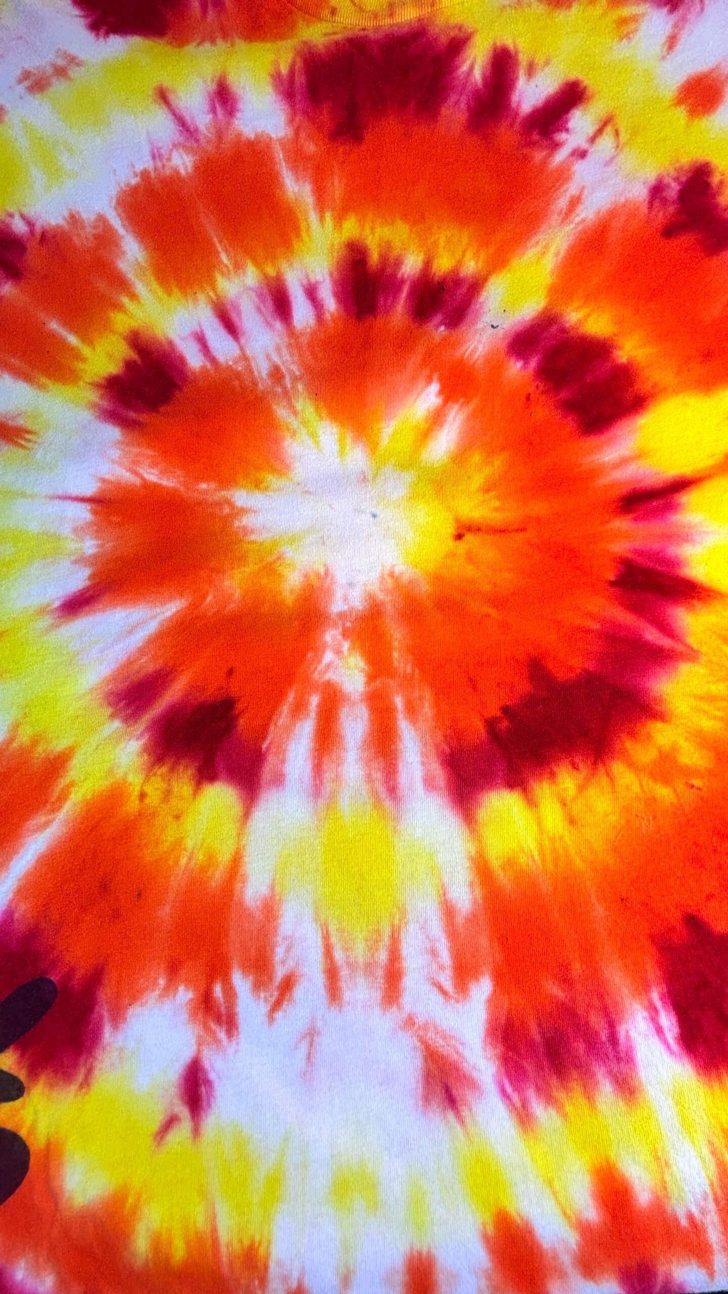 Super Flow Dyes Yo! All of my tie dye t-shirts combine kind design with vibrant and saturated colors. Hikari is deep thinker with yellow, orange, red starburst pattern. The source t-shirt is an LAT Style 6901 – made out of their super soft 4.5 oz. 100% combed ringspun cotton jersey. Comes with EasyTearTM label. Double-needle hem sleeves and bottom. Sewn with 100% cotton thread. Produced by a WRAP certified garment factory in Bangladesh. I design and make all my tie dyes by hand with love and care in Oak Park, Illinois, USA.