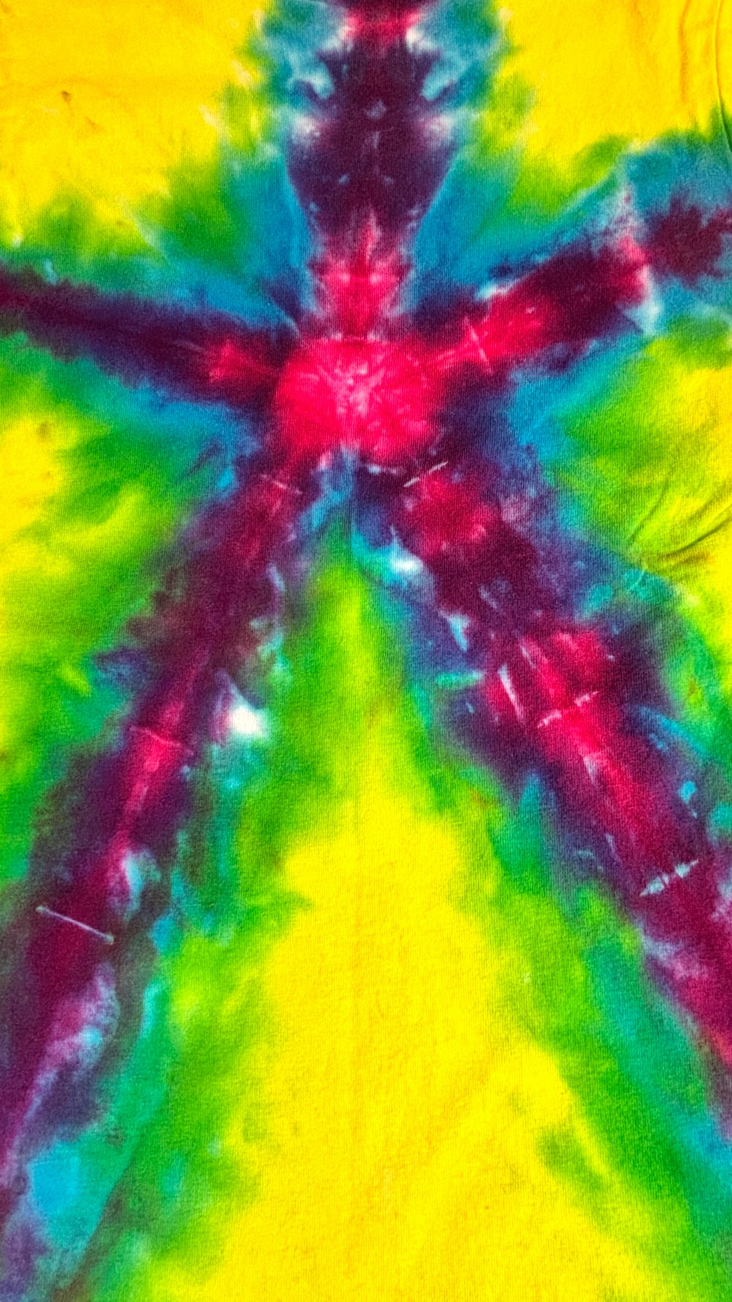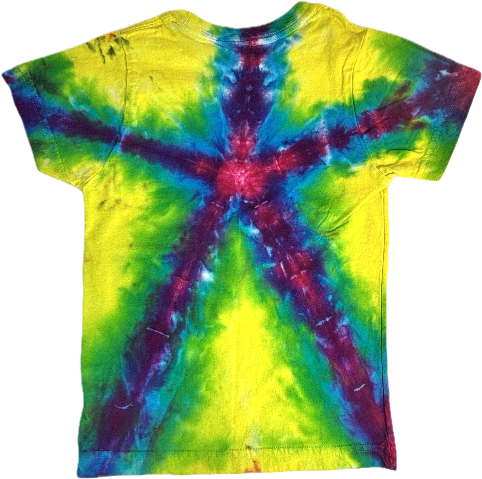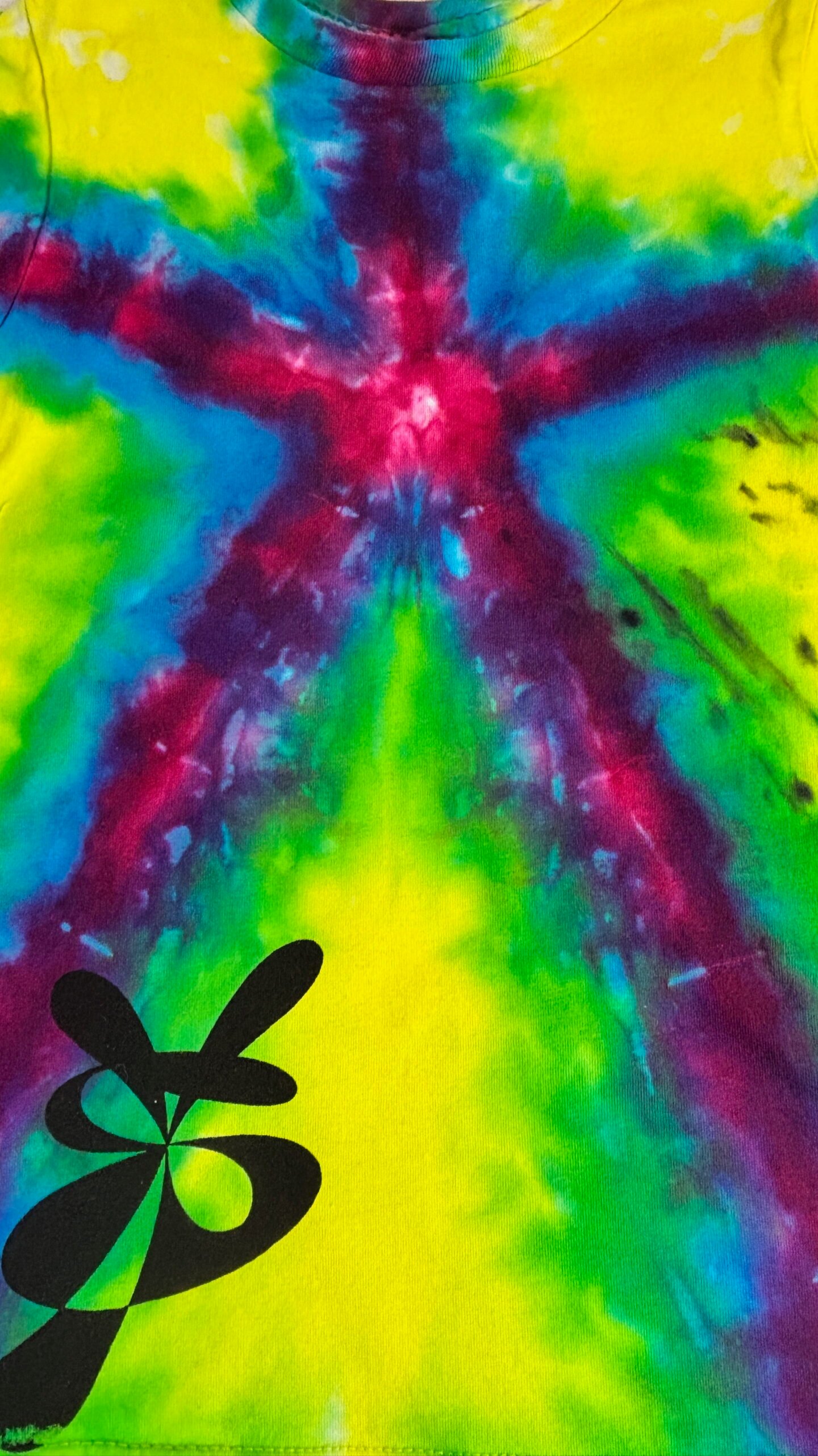 Super Flow Dyes Yo! All of my tie dye t-shirts combine kind design with vibrant and saturated colors. Kiku is strong with yellow, green, blue, purple, red star-man pattern. The source t-shirt is an LAT Style 6901 – made out of their super soft 4.5 oz. 100% combed ringspun cotton jersey. Comes with EasyTearTM label. Double-needle hem sleeves and bottom. Sewn with 100% cotton thread. Produced by a WRAP certified garment factory in Bangladesh. I design and make all my tie dyes by hand with love and care in Oak Park, Illinois, USA.