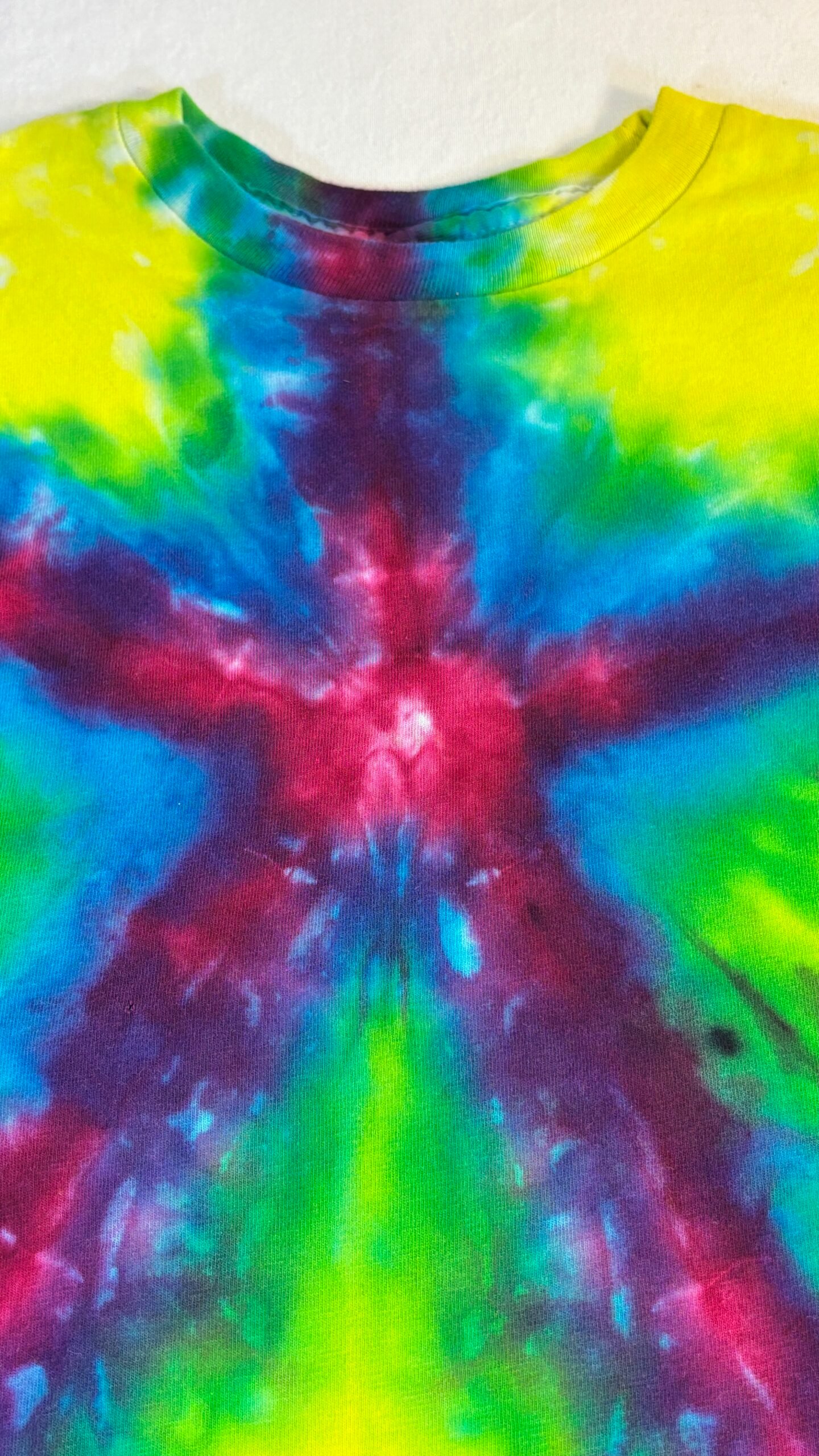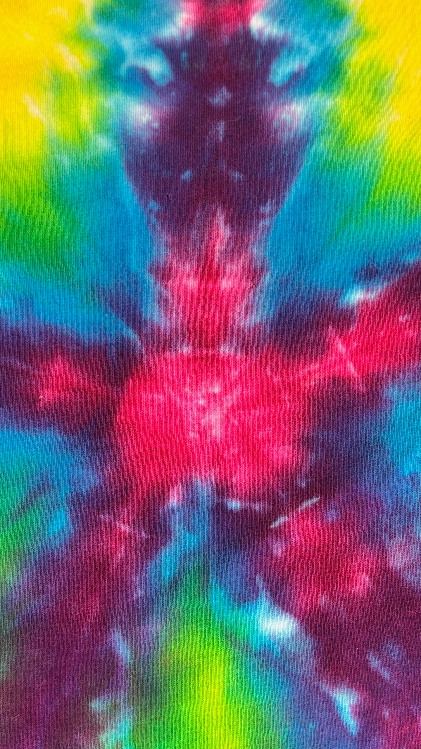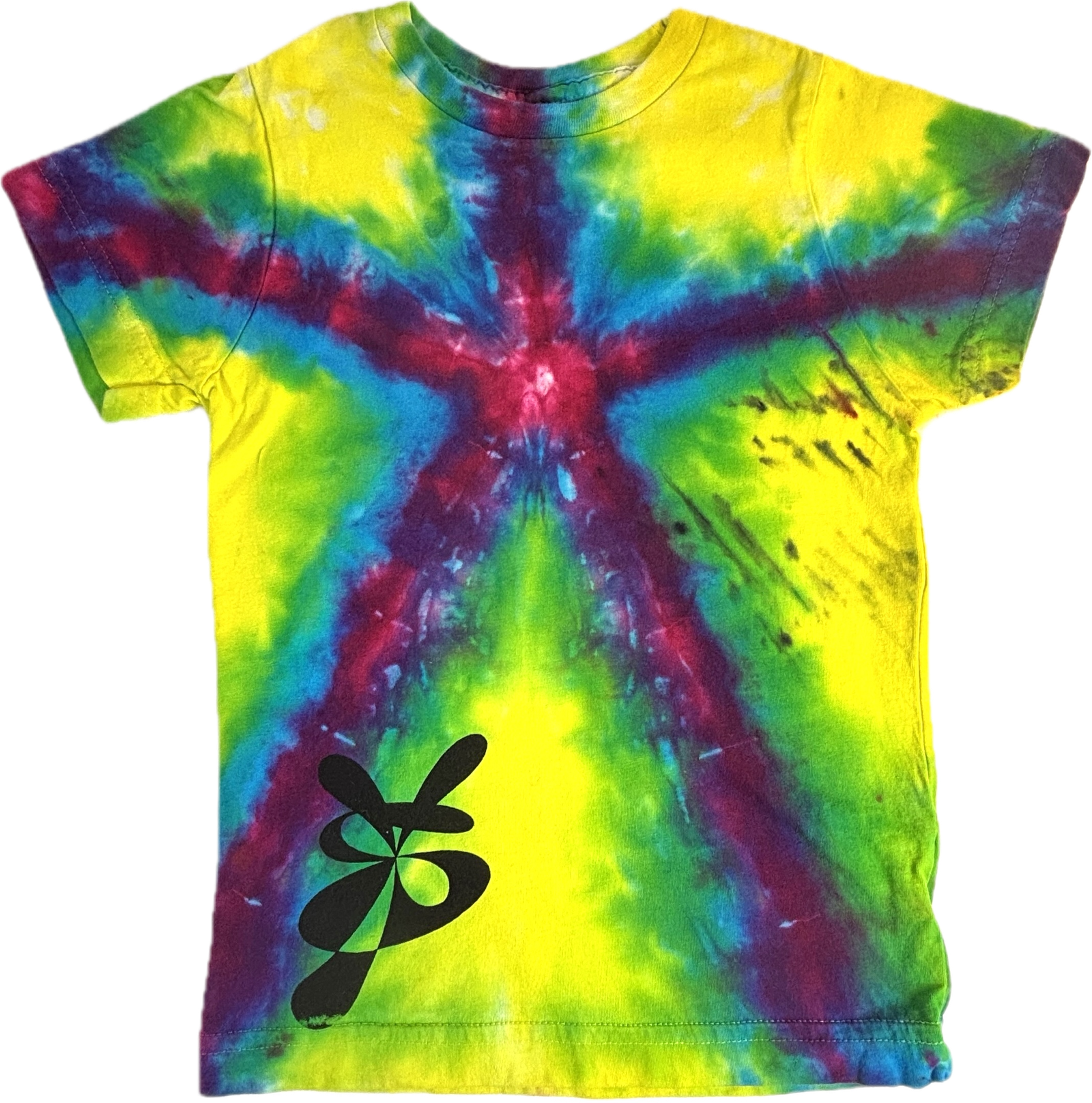 Super Flow Dyes Yo! All of my tie dye t-shirts combine kind design with vibrant and saturated colors. Kiku is strong with yellow, green, blue, purple, red star-man pattern. The source t-shirt is an LAT Style 6901 – made out of their super soft 4.5 oz. 100% combed ringspun cotton jersey. Comes with EasyTearTM label. Double-needle hem sleeves and bottom. Sewn with 100% cotton thread. Produced by a WRAP certified garment factory in Bangladesh. I design and make all my tie dyes by hand with love and care in Oak Park, Illinois, USA.