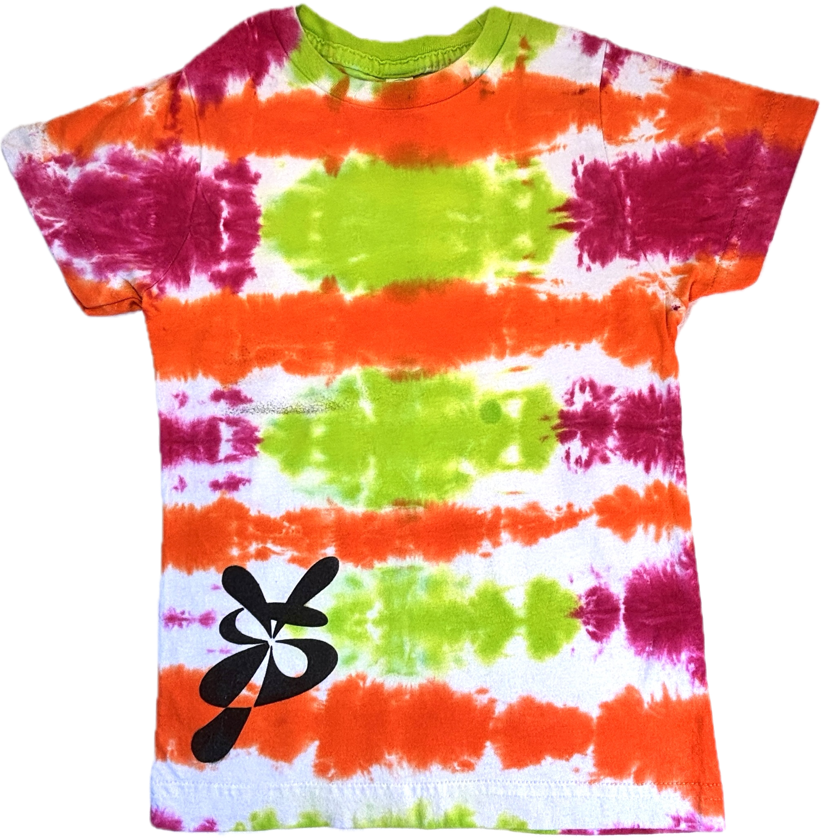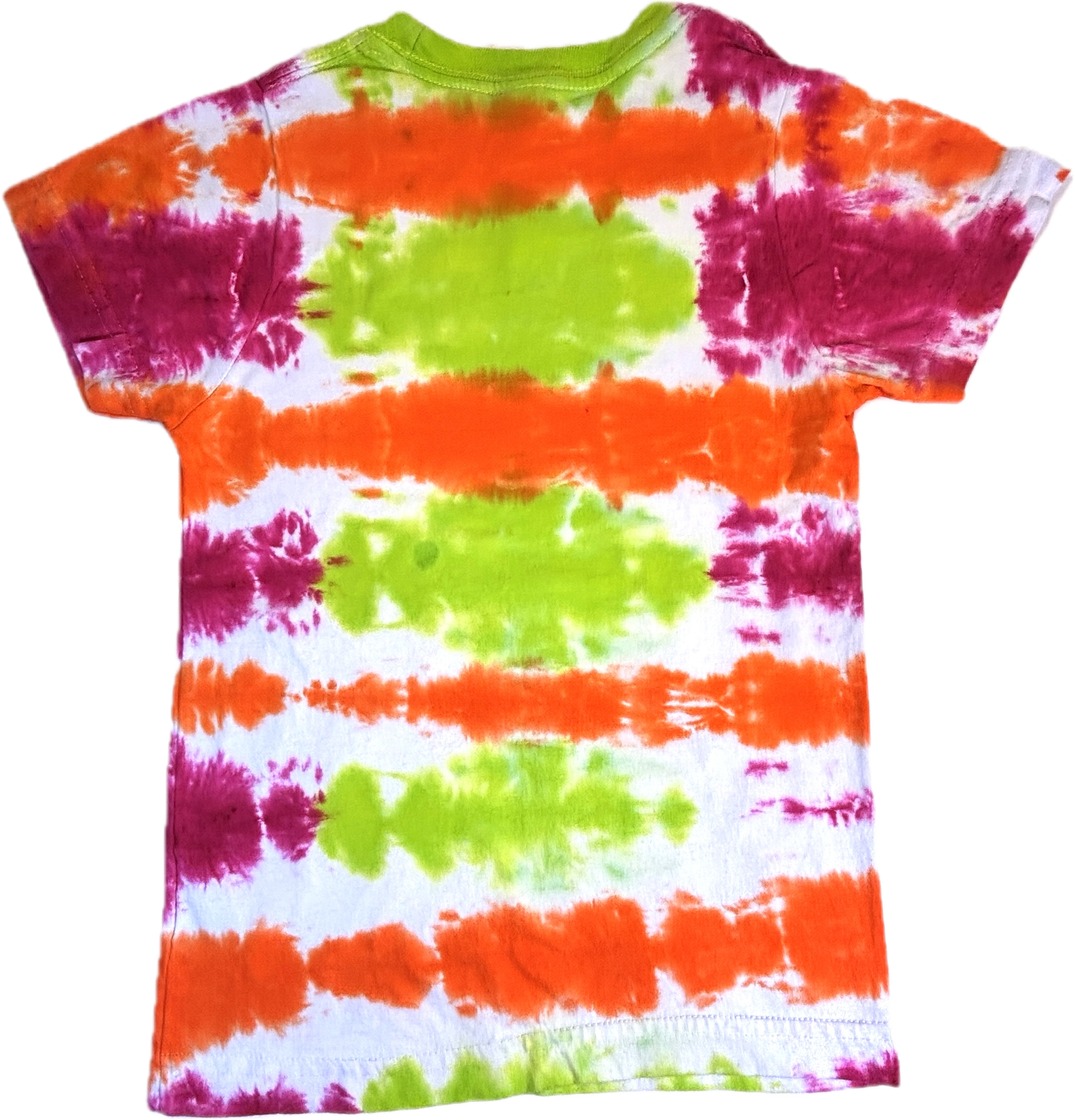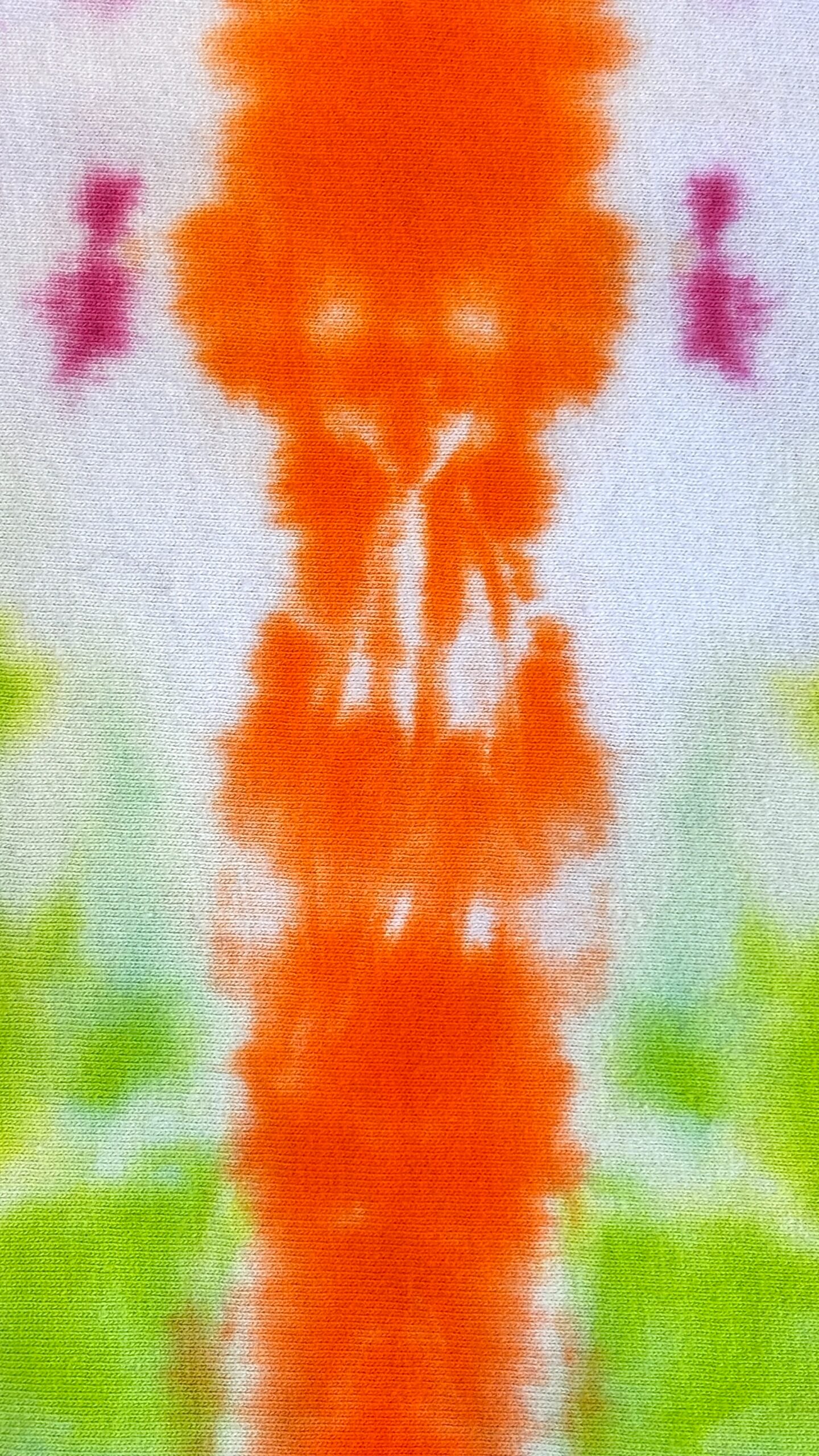 Super Flow Dyes Yo! All of my tie dye t-shirts combine kind design with vibrant and saturated colors. Santiago is smart & funny with orange, fuchsia, green blobby horizontal stripes pattern. The source t-shirt is an LAT Style 6901 – made out of their super soft 4.5 oz. 100% combed ringspun cotton jersey. Comes with EasyTearTM label. Double-needle hem sleeves and bottom. Sewn with 100% cotton thread. Produced by a WRAP certified garment factory in Bangladesh. I design and make all my tie dyes by hand with love and care in Oak Park, Illinois, USA.