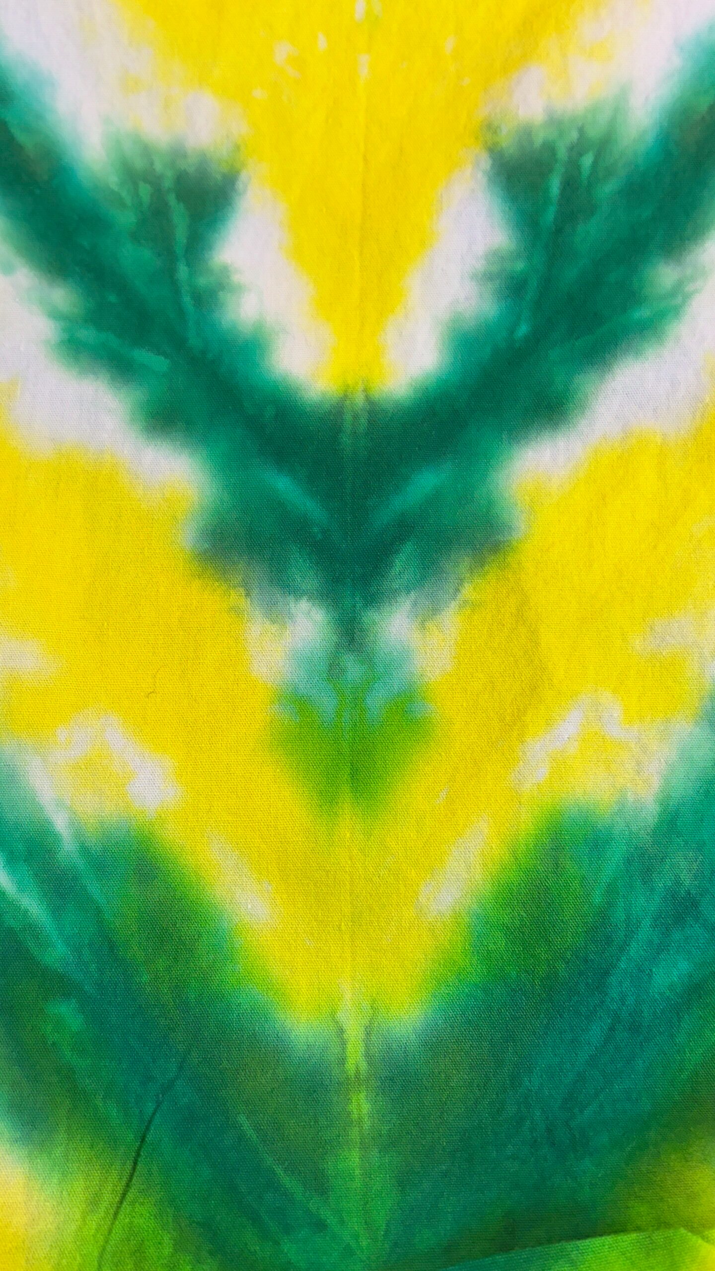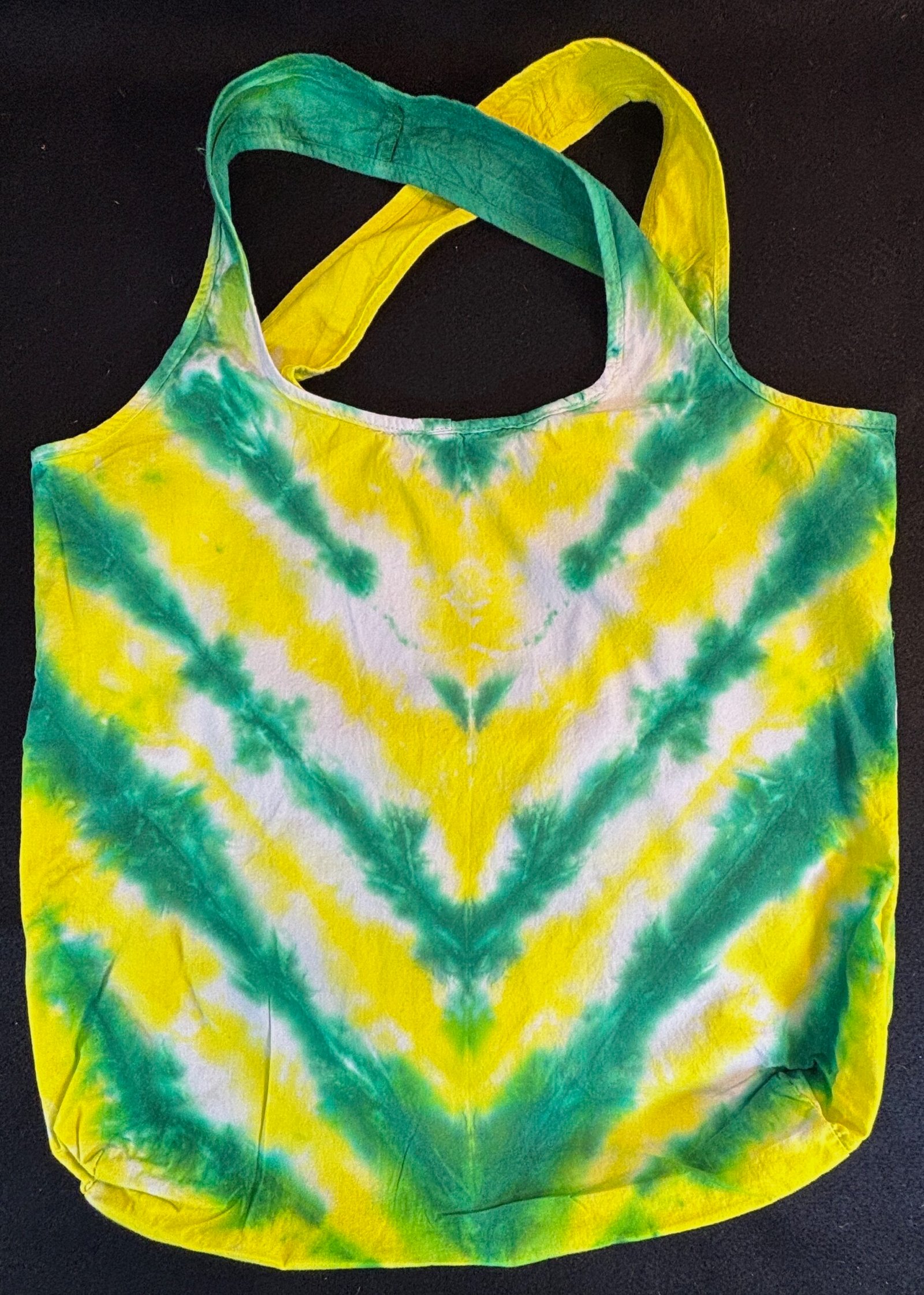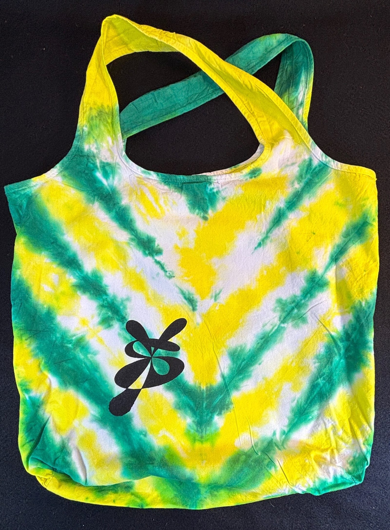 Super Flow Dyes Yo! All of my tie dye tote bags combine kind designs with vibrant saturated colors. Wanda is fickle & fun with yellow, green v-stripes pattern. This 100% cotton tote bag comes with its own attached storage pocket! The pocket lays inside and works great for keys and phones. Then just stuff the tote into the 4.5″ square pocket for storage. Great for groceries and so many other uses! I design and make all my tie dyes by hand with love and care in Oak Park, Illinois, USA. Have fun and find your flow with Super Flow Dyes Yo!